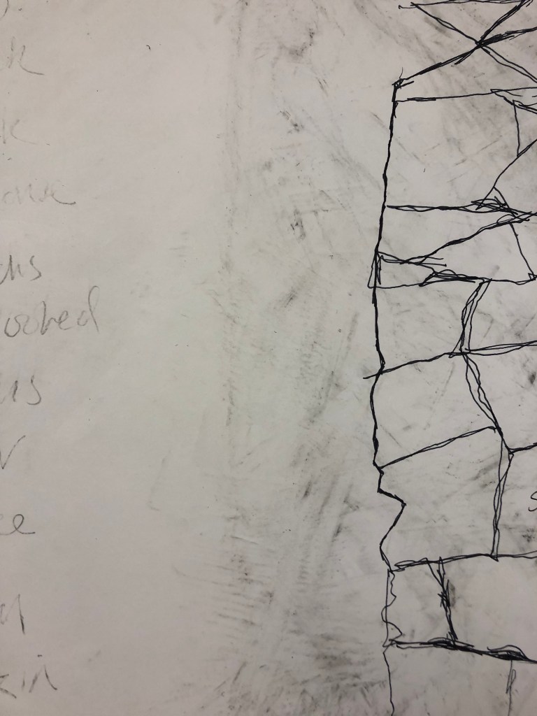 As I worked on the drawing for the the right hand side of the piece I got very annoyed that the drawing wasn’t representing what I saw in my mind. I started to erase the drawing and from it emerged a poem which I wrote down onto the frame to the side of the drawing.