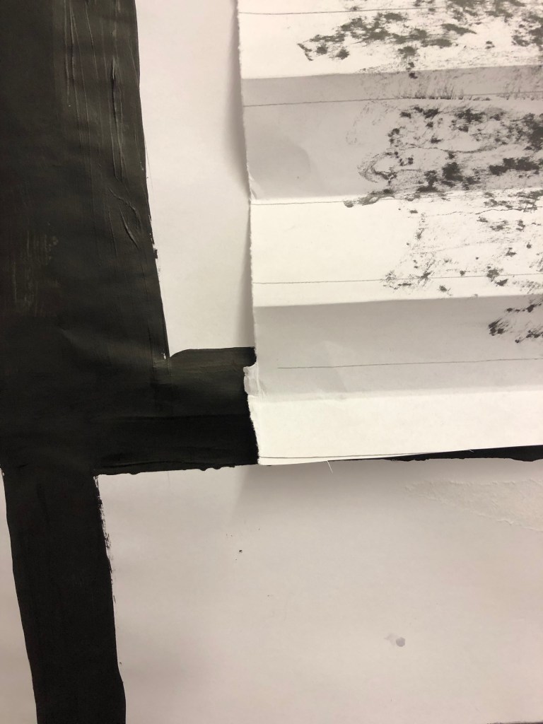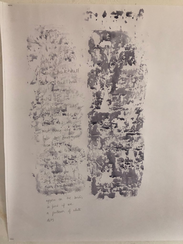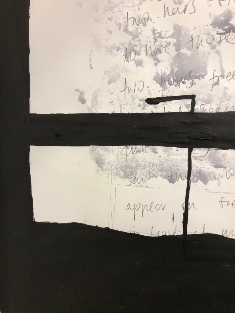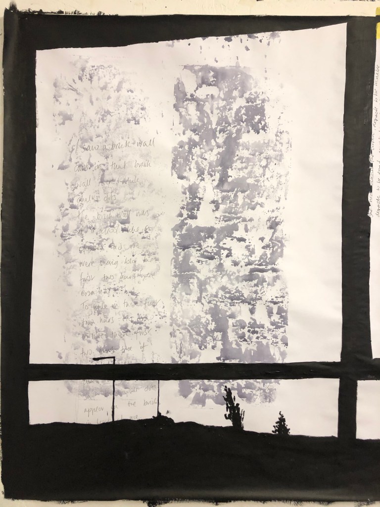 As I worked in my studio I brought many elements of the journey into the piece as I worked on it. I started with bringing the new studio into this one and drew out the window frame from the university studio on the left hand side. I had mentally divided the paper into three nearly equal sections. I worked on the left hand side, I started with some cut off paper and used wax to rub the wall onto the paper, I sprayed this with water and added some deeply pigmented Indian watercolour paint. I pressed this onto the main piece of paper and printed it twice over the words I had written.