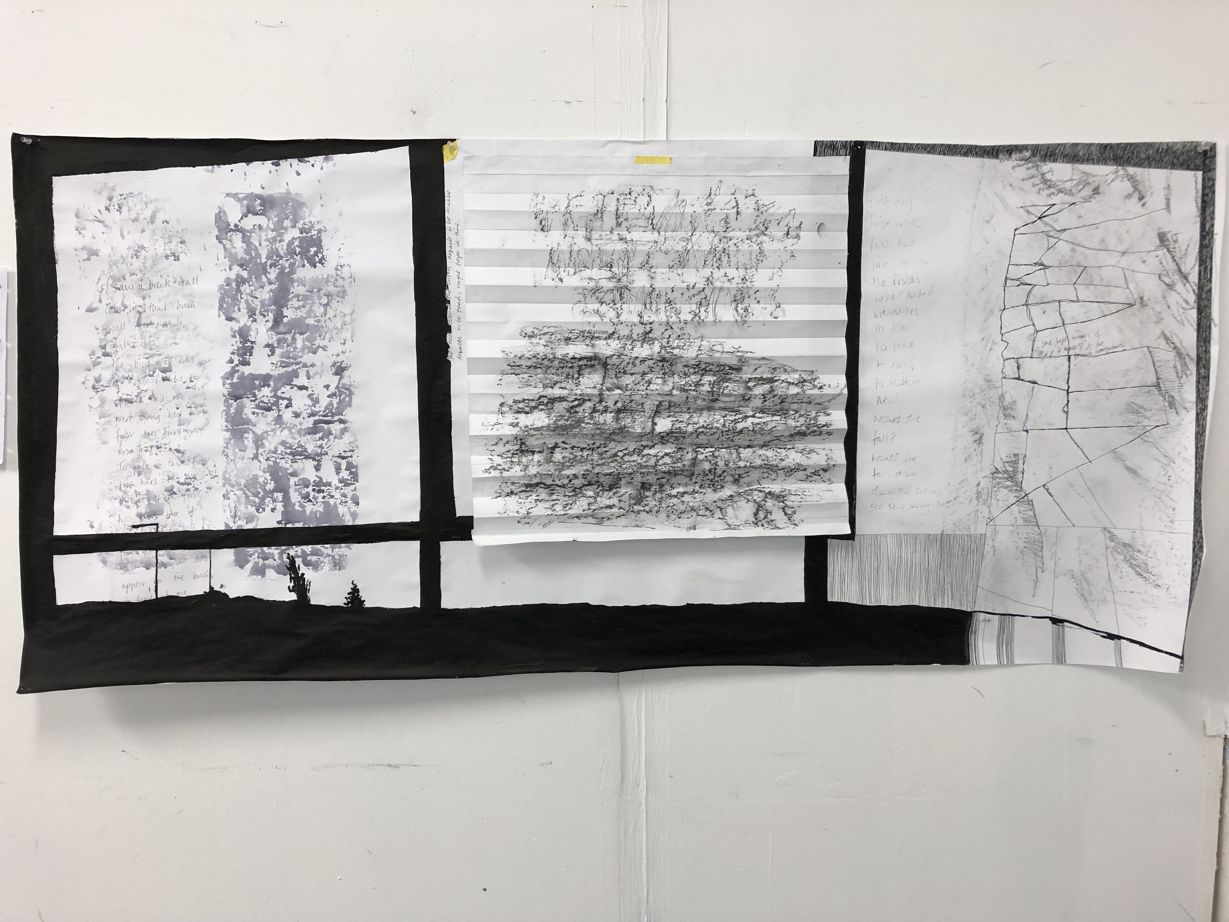 I presented the work on the 1st October in the postgraduate seminar space. Explaining how I worked in series and often threes, I had used this in the composition bringing the new studio into my old studio to make the work via the frames and windows drawn and photographed on my iPhone. Kerry Andrews really liked the fine drawing of cracks. The overall reception of the piece was positive as a depiction of the first week in the postgraduate course and the journey into it was of interest in my process.