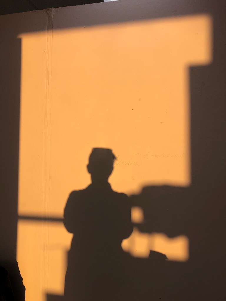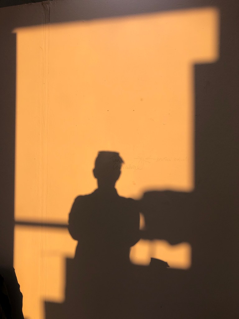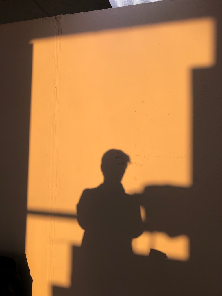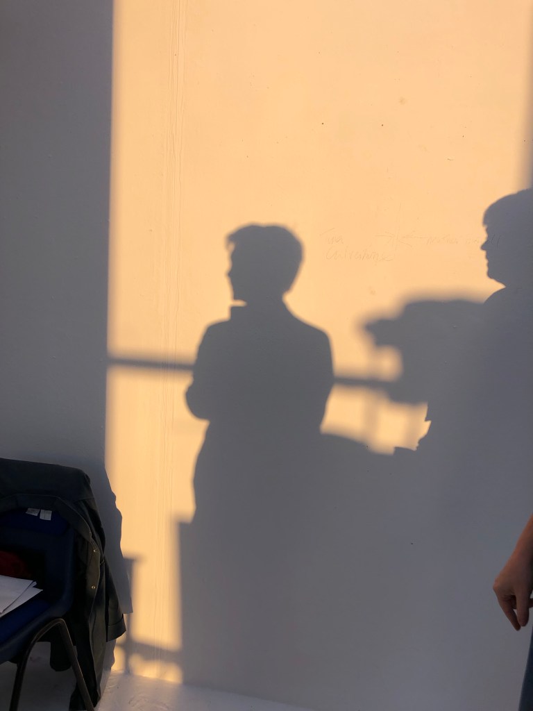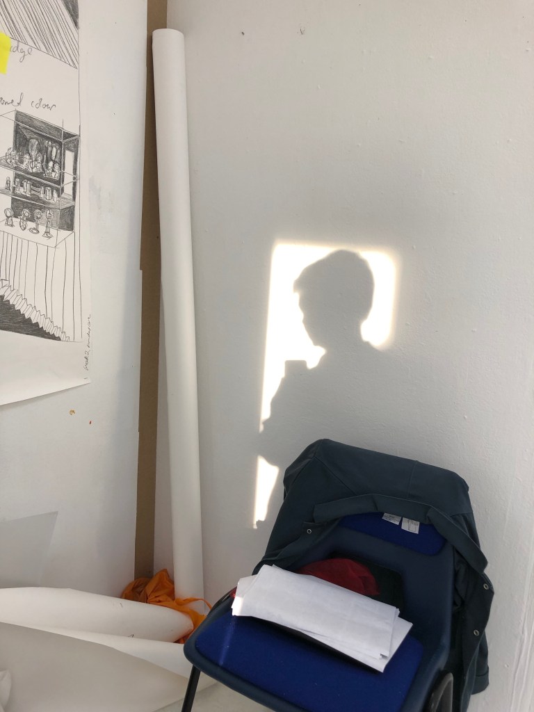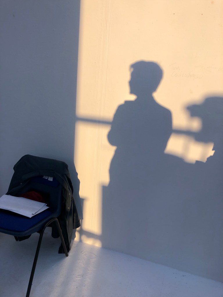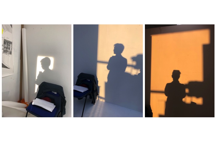 Having already explored my studio space I thought that using the evening light into the space might be a good starting point. I liked my chair with my work jacket on it, as a describer of my being an artist and it invoking some of my personality. I placed it within the space and the light was good to take a shadow portrait. As the light changed I used this change in hue and tone until the light was finally in full sunset and golden. I was working around others in the studio so needed to wait for the right shots. I was also carrying on with making my work too and a series of work with found objects and the shadows cast in preparation for planning some darkroom photograms.