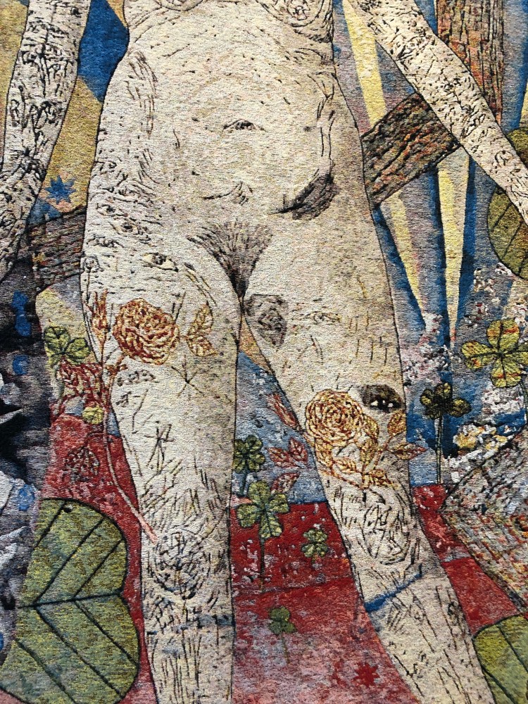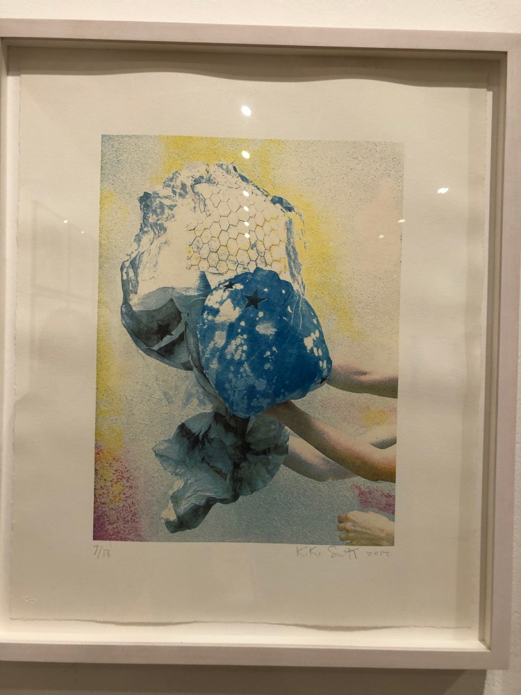 I visited the Kiki Smith show at Modern Art Oxford after postgraduate tutor Michael Wright had mentioned Smith in the taught seminar I attended on printmaking. Michael had explained how Smith was a cross discipline artist and had made very spiritual works. I was curious as I started to research Smith and discovered how she had a long and varied career but had refused to talk in depth about the content of her subject matter. I learnt that she made huge tapestries and as an artist who uses cloth and fibre in my practice I had to visit the show.