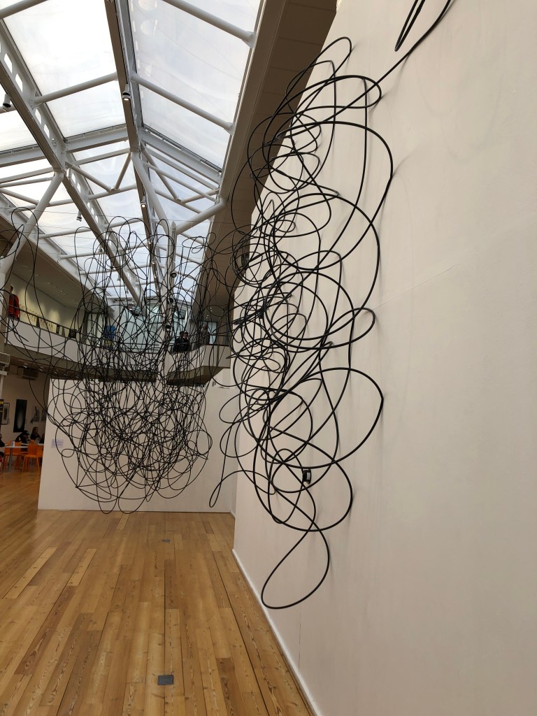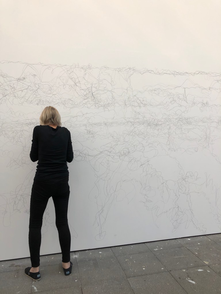 I attended the opening of Line / Extended, a group show at UHArts gallery. The artists on show were Rosana Antoli, Andrea V. Wright, Jane Grisewood, Lucy Brown and George Eksts. I was interested in this show because I use line, drawing and installation extensively in my practice. The automatic drawing performative piece Blind Lines (Grisewood, 2019) on the opening evening was fascinating look at a sensory approach to drawing. Below are some action documentary photographs I took for my research during the opening and some afterwards.