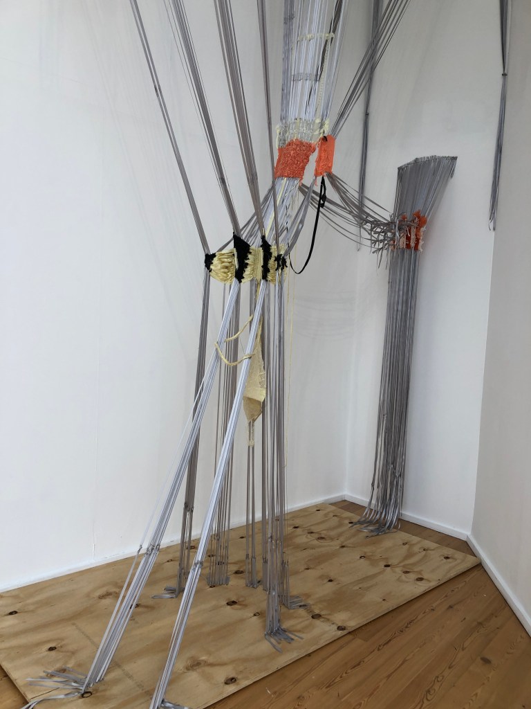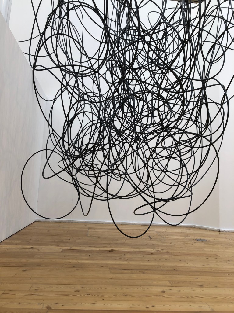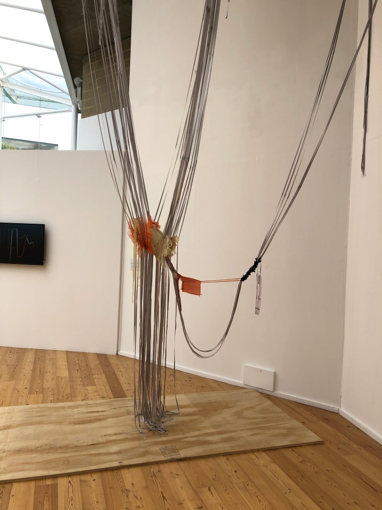Andrea V. Wright’s work was interesting, but for me, in a different way. Her piece, also site specific, Vertical Ascension (2016-19) made of wood, cloth and tape extended into the space and across the gallery wall. I have experience making installations, so was interested in her fixed wooden structures and how they held their presence in this vast gallery space successfully. Like myself, she spent some time away from the art world and re-established herself in 2010. Using a mixture of found material, her practice methodology is not purely conceptually based but is led by the materials which are ‘manipulated whilst weighing up the juxtapositions these material describe/allude to when placed together.’2 (Royal Society of Sculptors website, 2019). There is an immediacy to these resulting drawn and sculptural installations.