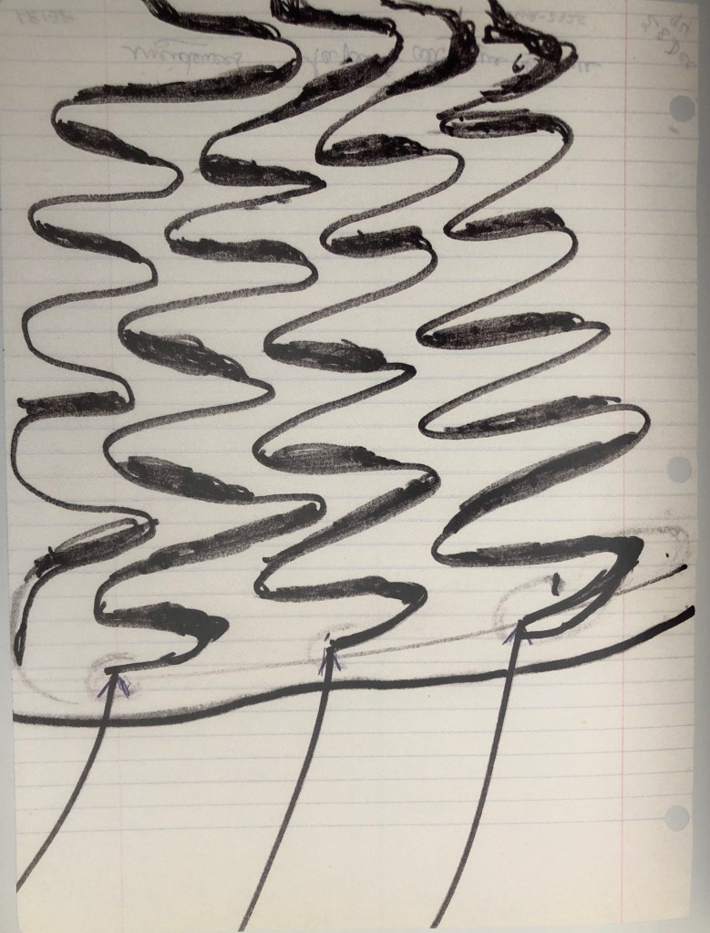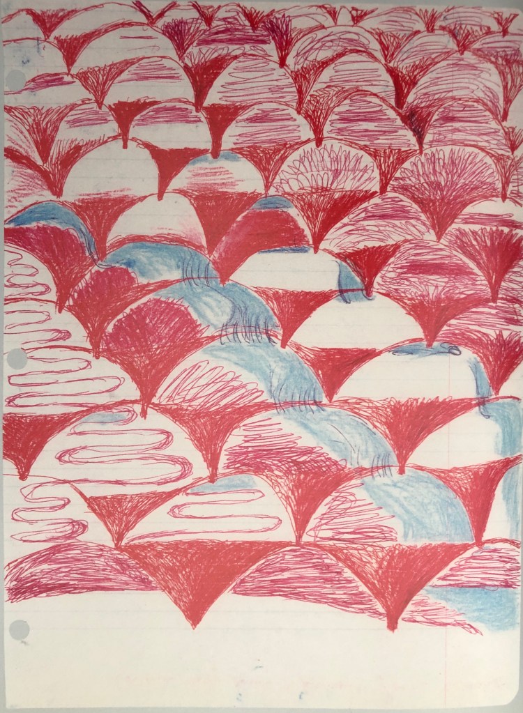 Her insomnia work which was not supposed to be seen or published, Bourgeois is tapping into a portal that opens during these in-between times of insomnia. As sufferer myself I found it to be a time when you can have intimacy with your memories and thoughts that you cannot always access when others, especially those close to you, are alert and conscious. I have found, this is not a subconscious thought process, more of an automatic one when your thoughts and memories are fluid and connected like at no other time of the day or night. Frances Morris acknowledges this in the book’s introduction and I paraphrase her words, that women have a special association to this time as there can be no domestic activity, children are asleep and no other duty calls. Morris points out that Bourgeois ‘cautioned herself not to underestimate listing of/associations and verbal associations of meaning’ (Morris, 2013, p.19). Like Bourgeois I can tap into this rich vein of thought, revealing the past in a raw and intimate way that cannot easily happen at any other time. With the cloak of darkness and the relaxing of the conscious slipping into a world of other allows access to more difficult areas in ones memory. Shown below are three drawings that I found closely matched her ritual, returning theme and motifs that I have recognised throughout her work.