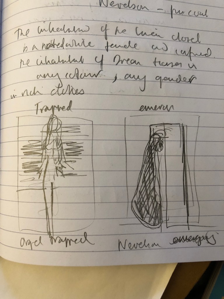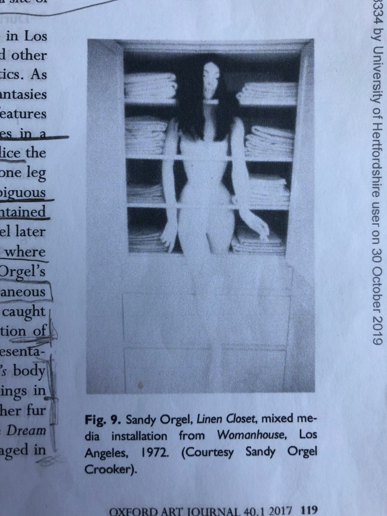The excerpt I chose to study for the Critical Analysis in Research and Enquiry was complex. There was initial excitement at finding a piece of writing that expressed so many elements I am pursuing in my own practice. Taking the energy from that excitement, I had to get down to the nitty gritty of understanding the complex arguments within the text. It took many drafts trying to understand the various elements, but one element was being illusive so, I took to my pencil to try and really understand part of the argument the author was making about the differences in the two pieces of early feminist works by Louise Nevelson and Sandra Orgel respectively. Both were describing the plight of the feminist in the domestic, ritual and work driven female role. The evaluation of the pieces and how they contrasted were complex as she had drawn her conclusions by comparing two visual components within the article. One was of Orgel’s Linen Closet (Womanhouse, 1972), figure 1 and one was of Nevelson’s Dream House (1972) figure 2 from which she was performatively emerging (see below).
