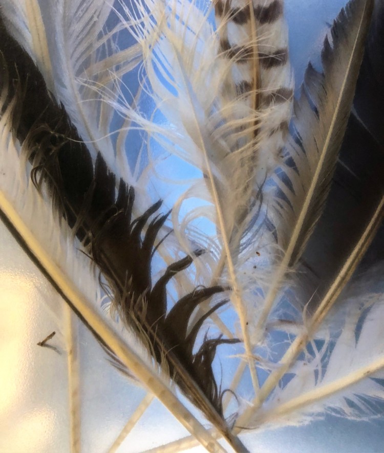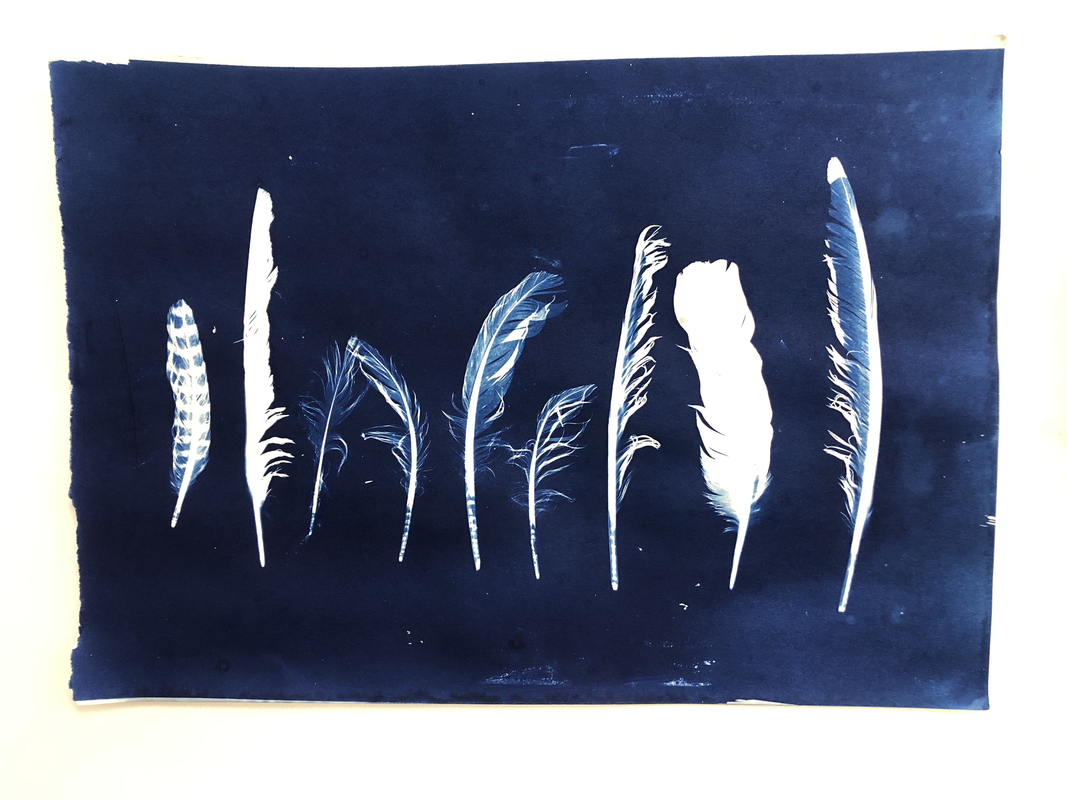 Fig 1 Part of my ritual collection of feathers gathered during a month long writing ritual. The rule was to pick up any item I actually walked onto in my path. I have used this in photograms and cyanotypes as an experimental starting point to make new work.