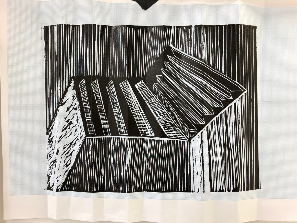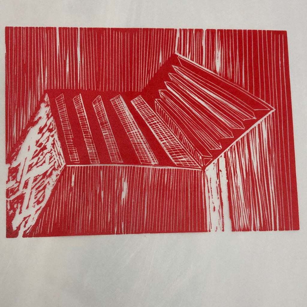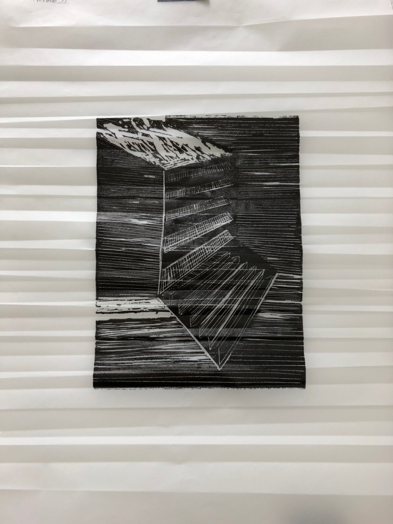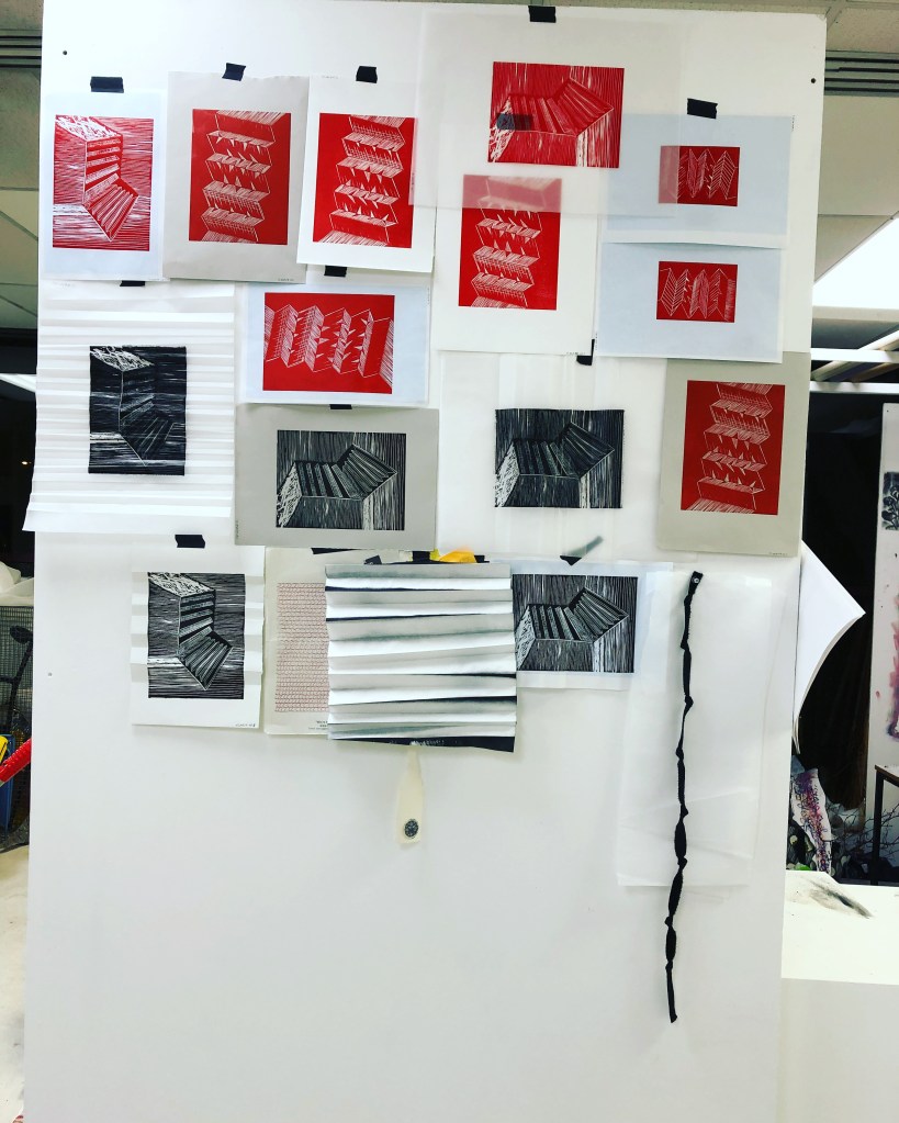 Since my last crit and during Semester B I worked in the print room making some Lino-cut prints I cut during December and January. I went on the drypoint induction and made two plates shown below. For the Lino cuts I wanted to experiment with papers and colour, so I used some grey paper, graph paper and red inks. I also mixed some red into the black ink to create a richer black.