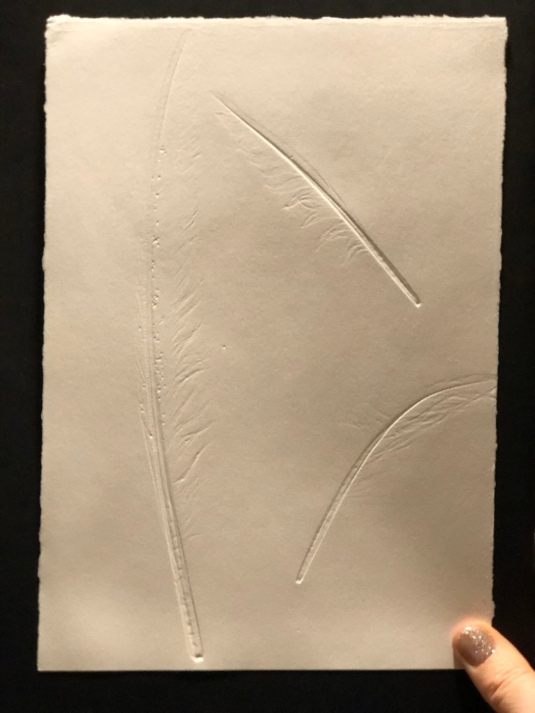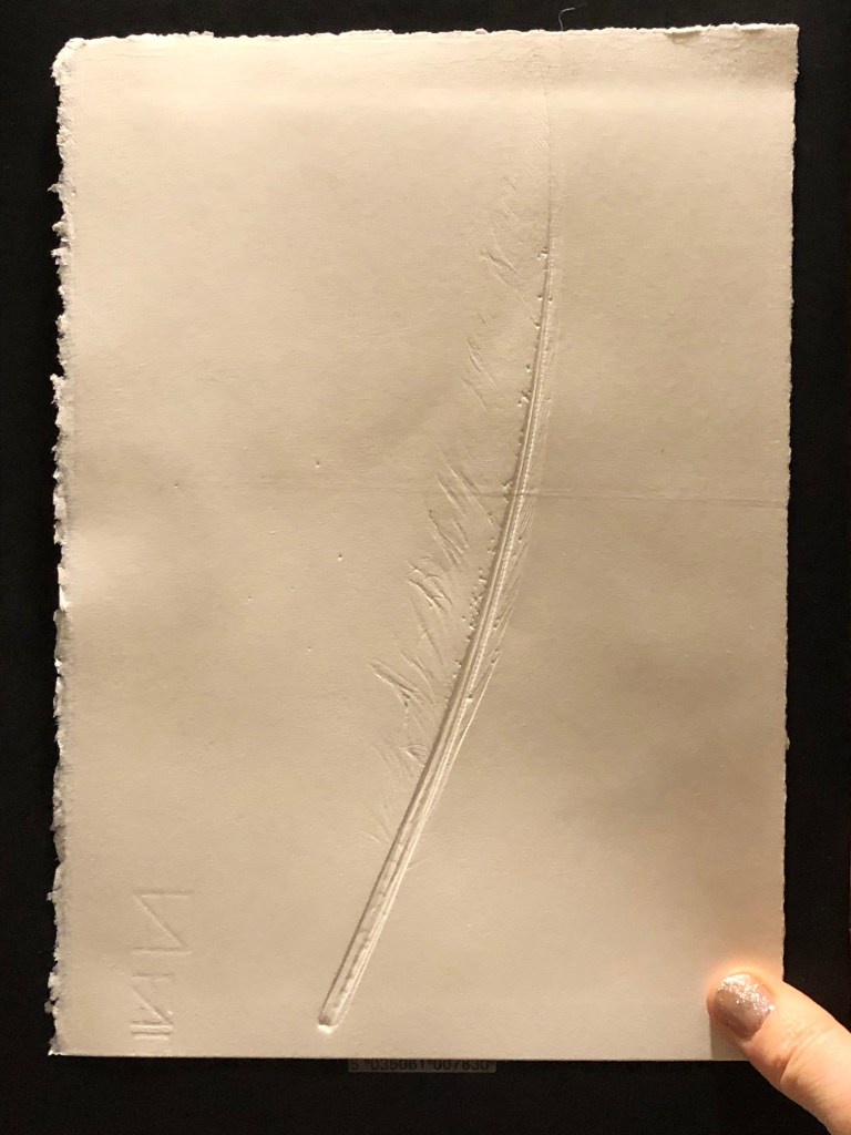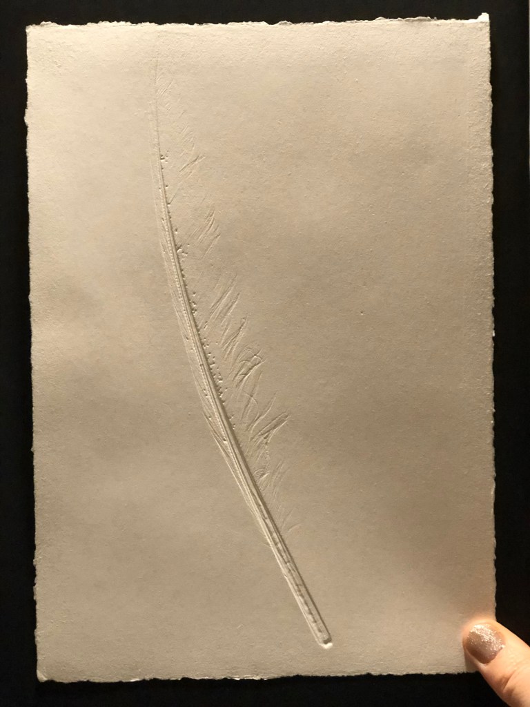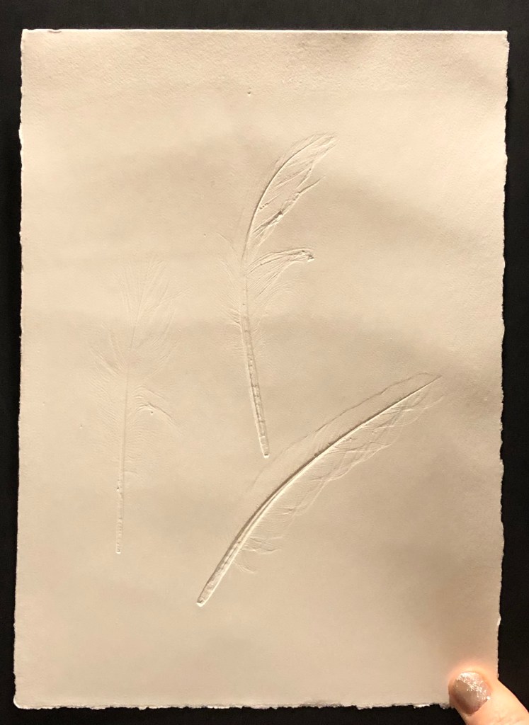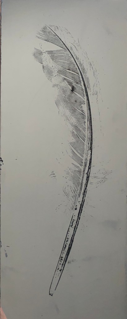 Before using the feathers for the making softground etching plates, I ran them through the etching press with damp paper to create impressions of them before their sacrifice to the plates. The impressions are difficult to see, but once they are held up to the light, their delicate details come into relief.