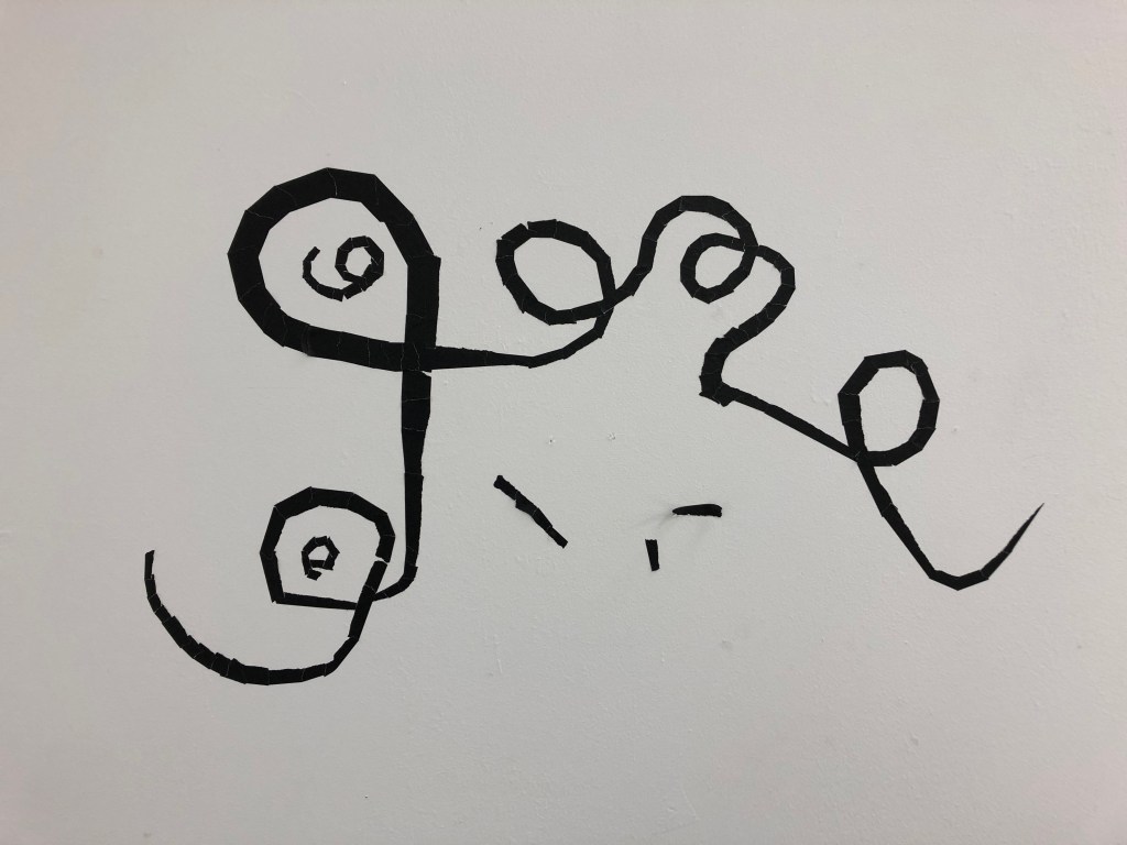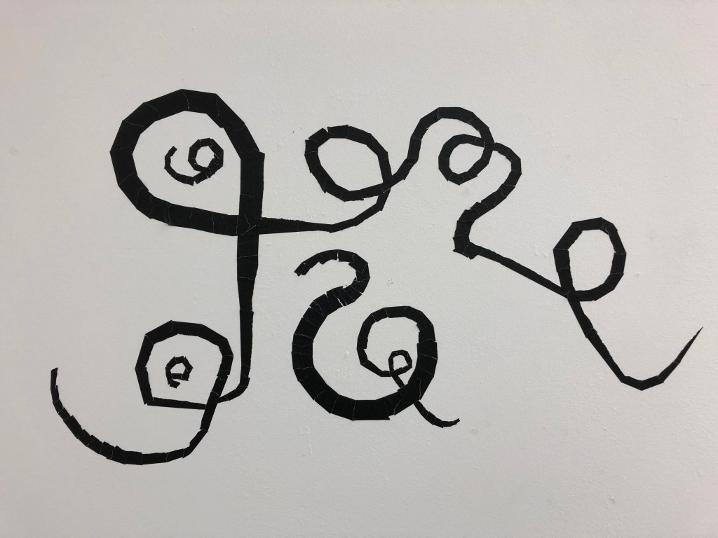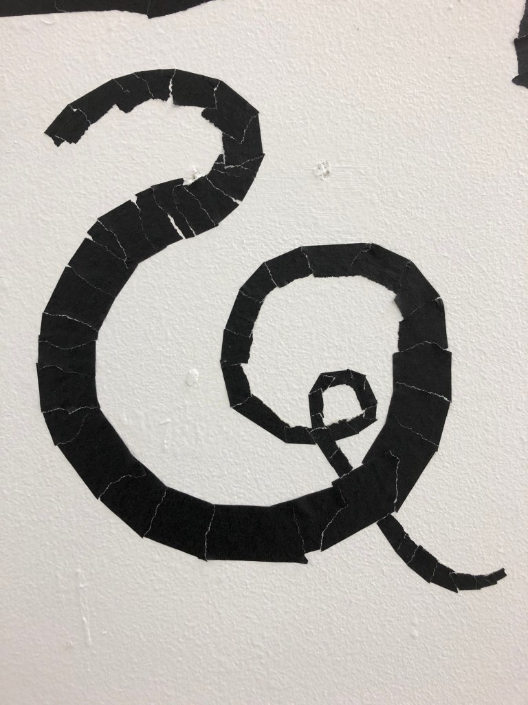 I cleared my studio space in the post grad studio and painted it white. I worked on drawing directly onto the wall with black tape. I made one wall a bigger than life size version of work I had made very small scale in my sketchbook. In this installation the edges of the walls are important, just as the edges of the paper are for the small drawings. The feeling from this work is intended to be a disorientation of the space. A sense of falling, of moving, perhaps a shift.