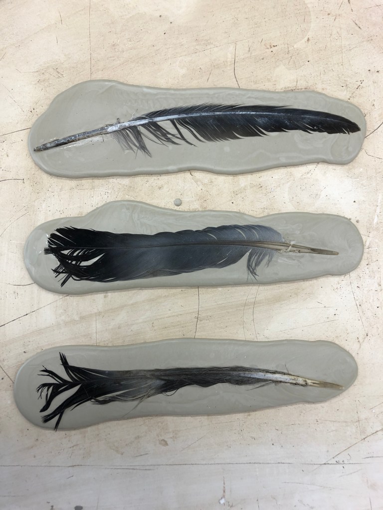 a selection of the feathers pressed into porcelain tiles ready for the kiln