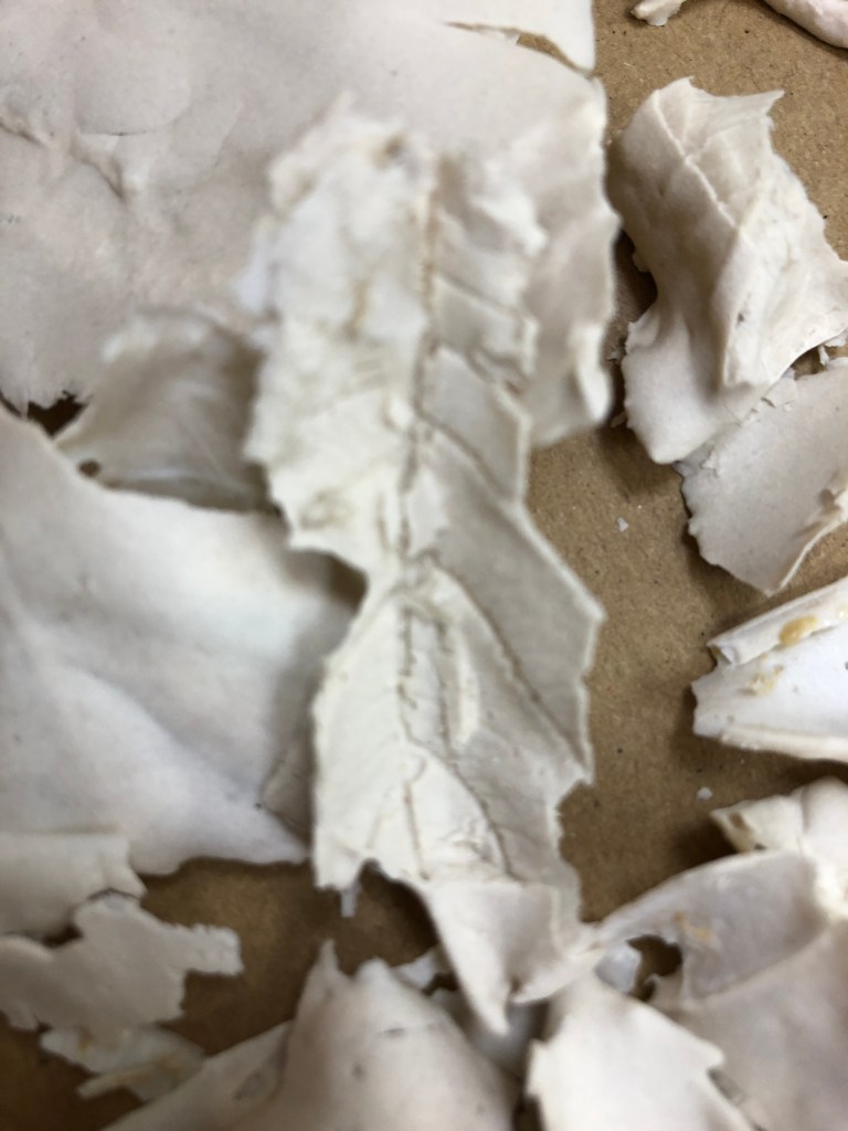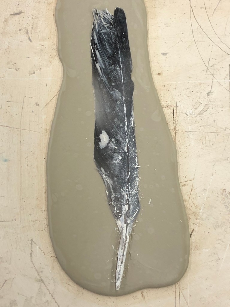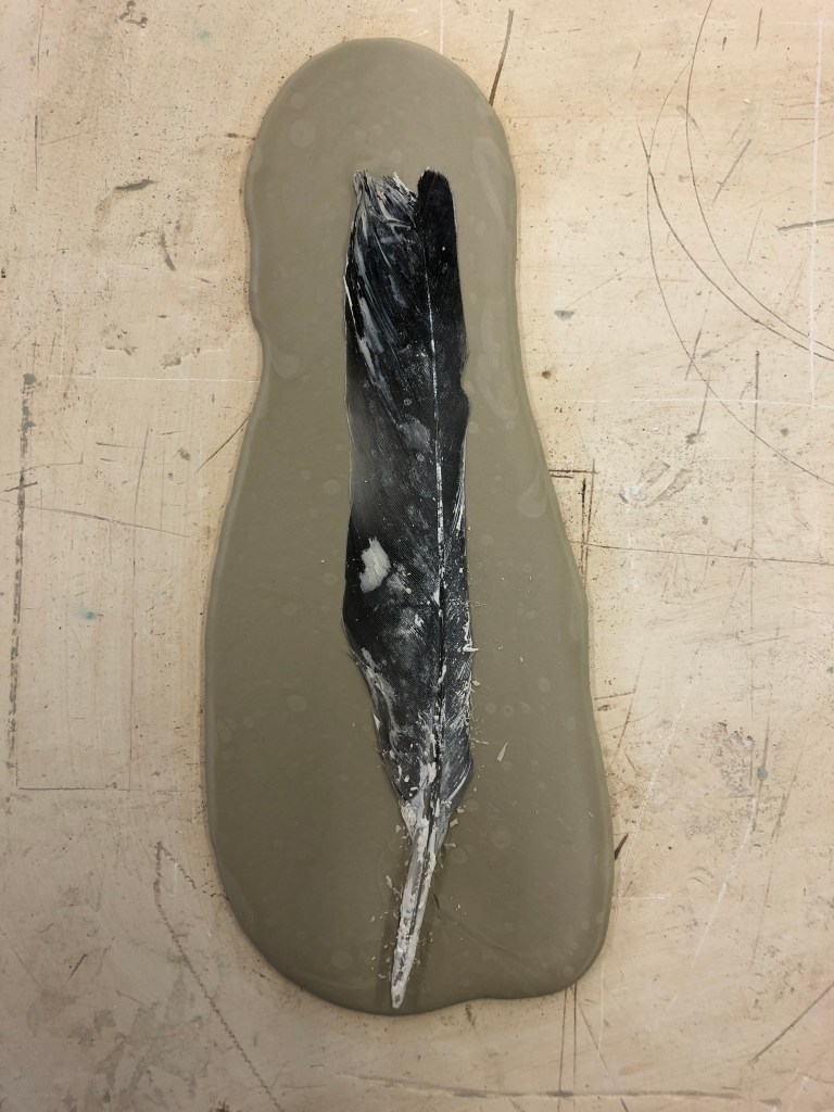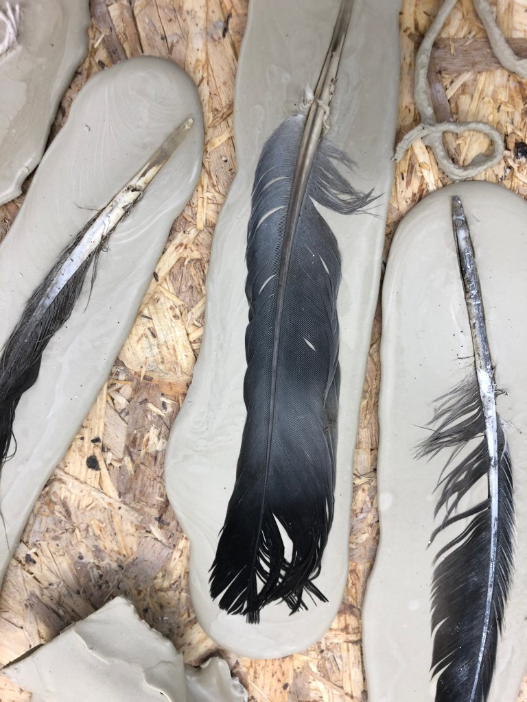 I also had previously wanted to use my ritual finds to make some fragile objects and used the slip onto plaster batts to impress some of my feather finds. The result were very fragile ’tiles’ to which the feathers were a sacrifice.