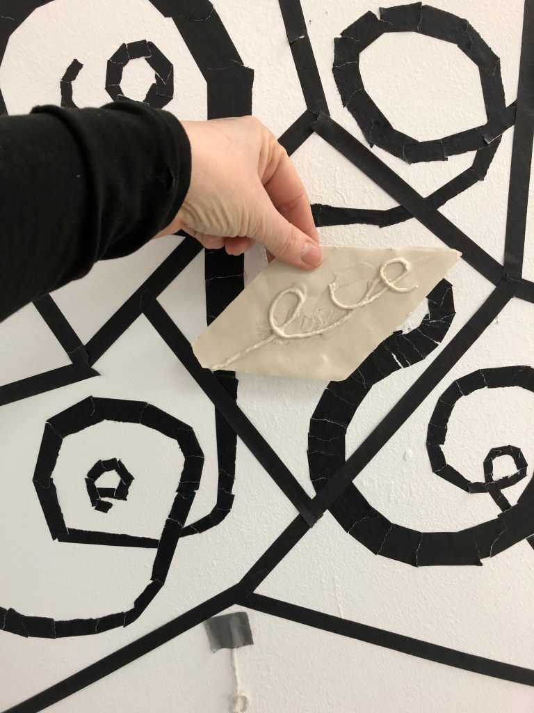 I used paper cut outs from a sculpture dipped in slip to create a tile back for some of the pieces