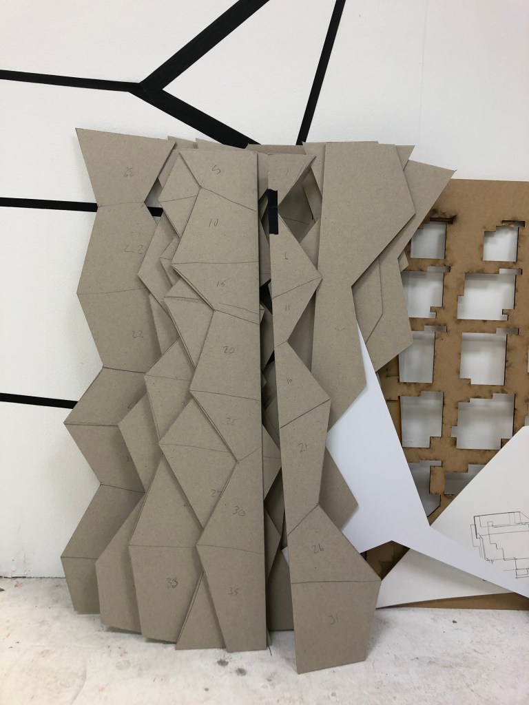 I had ideas for making some small scale sculptures and started to make maquetts of these. I worked some into larger cardboard and installed them as leaning pieces into the studio installation. I had made 2d versions of these as paintings too and have worked on these images and 2d and 3d ideas in my sketchbooks. I plan to make some versions of these as large scale pieces in plywood when the workshops reopen and want to add to the installation already started.
