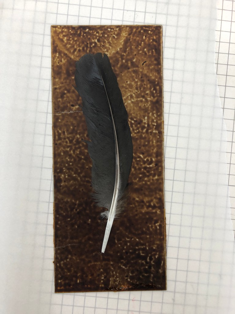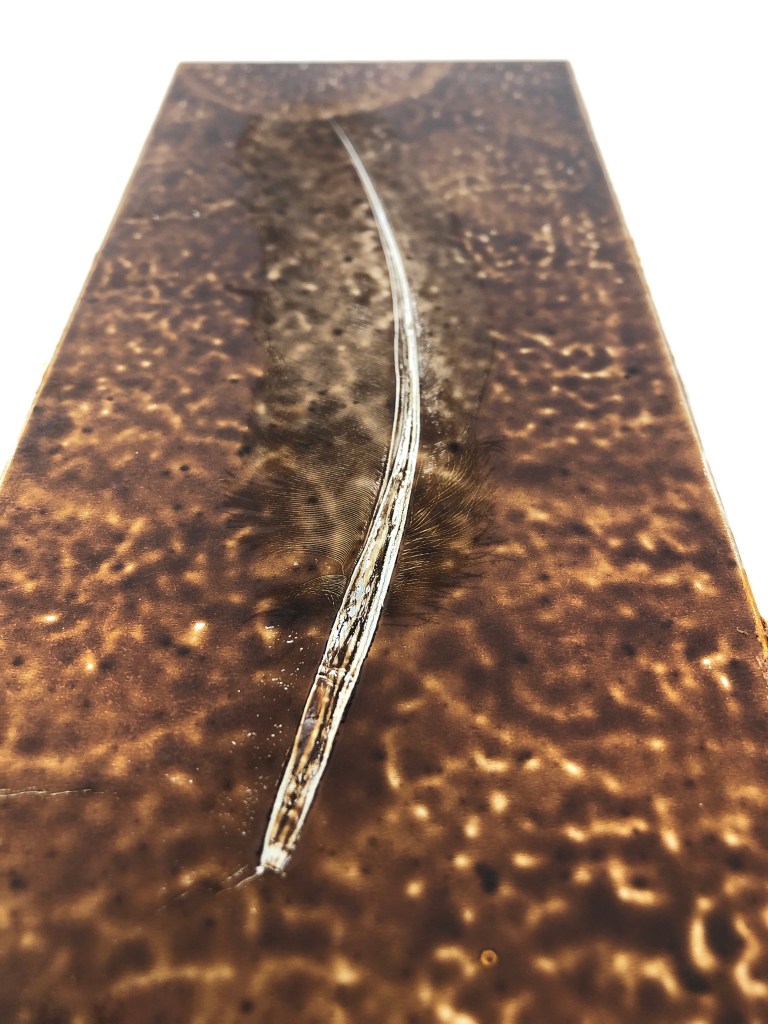 Making a larger slip tile and leaving the feather in the slip for firing