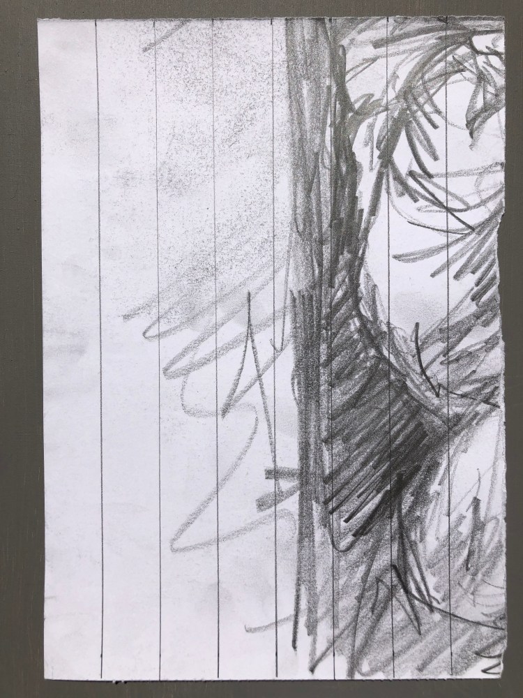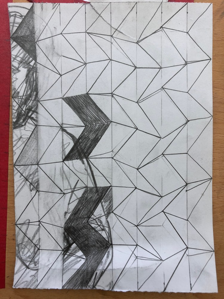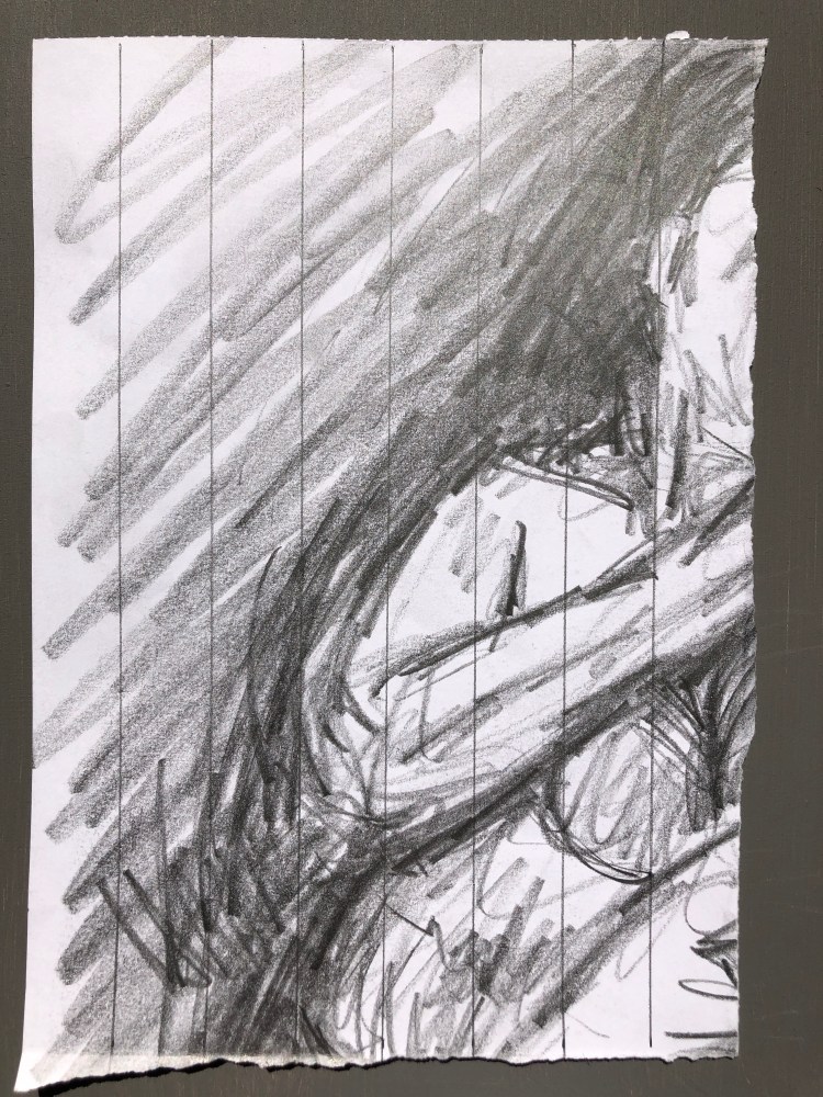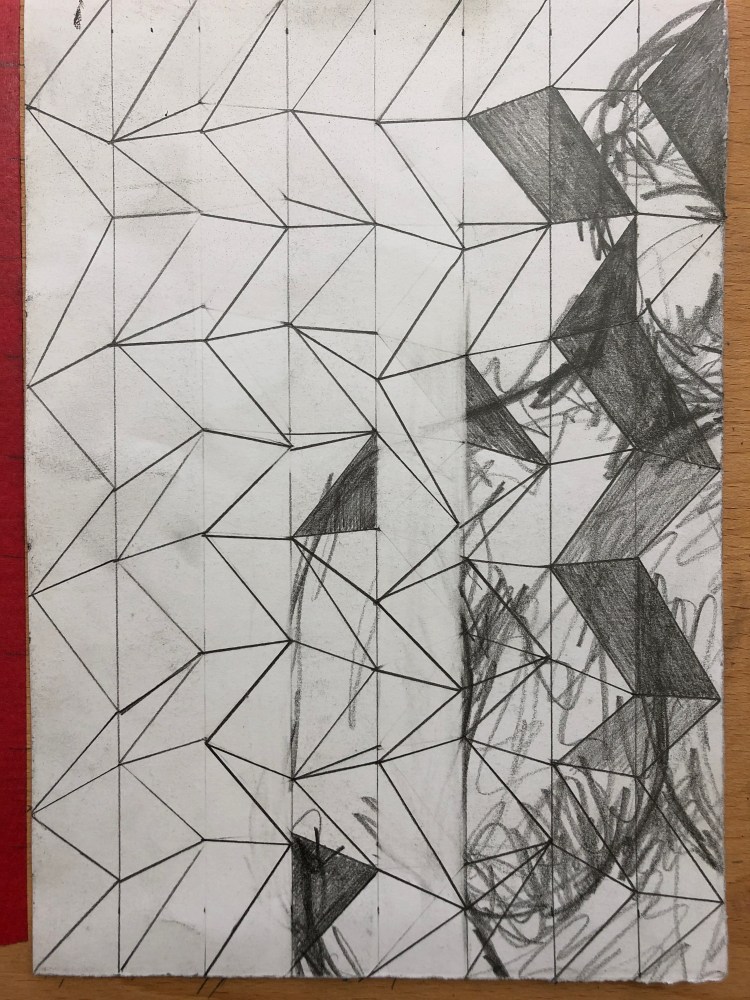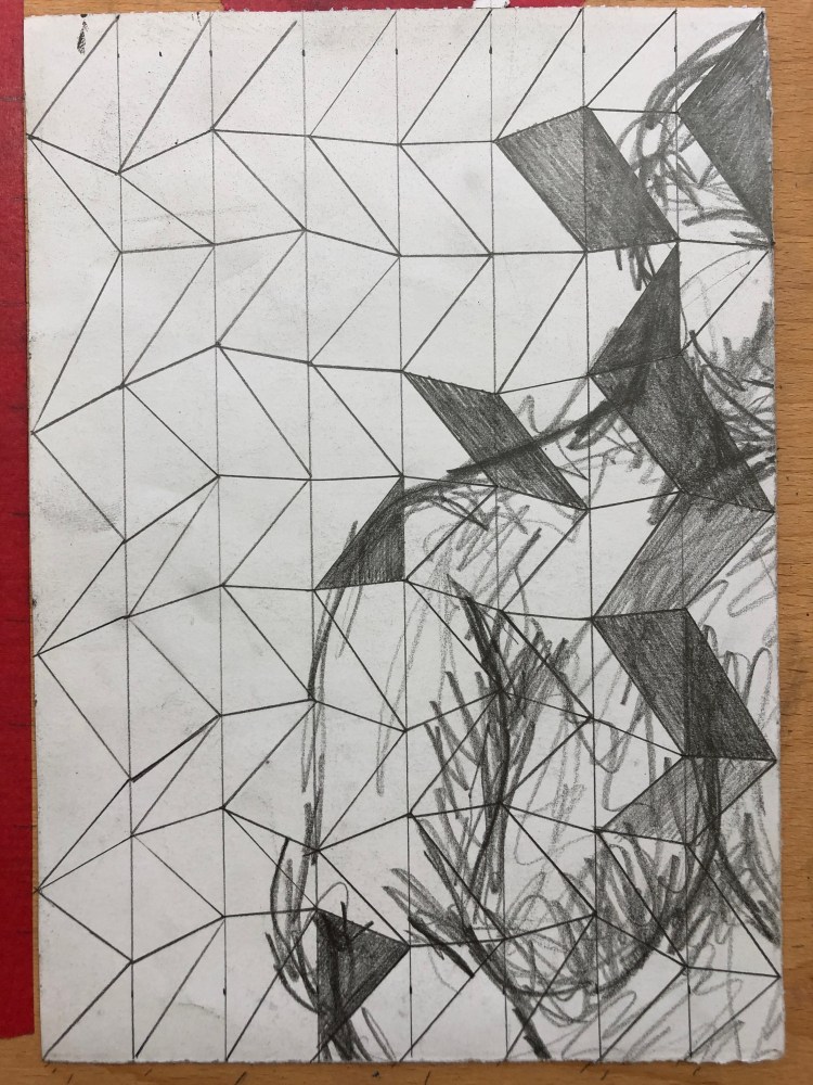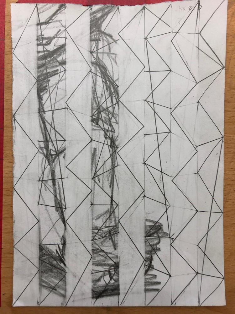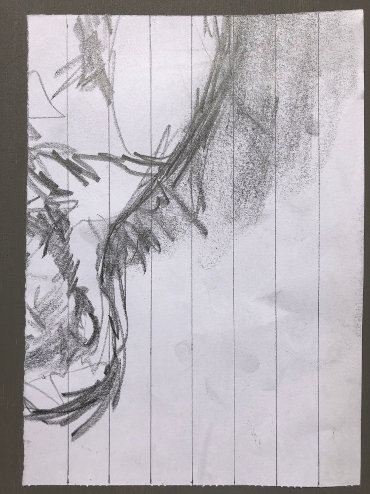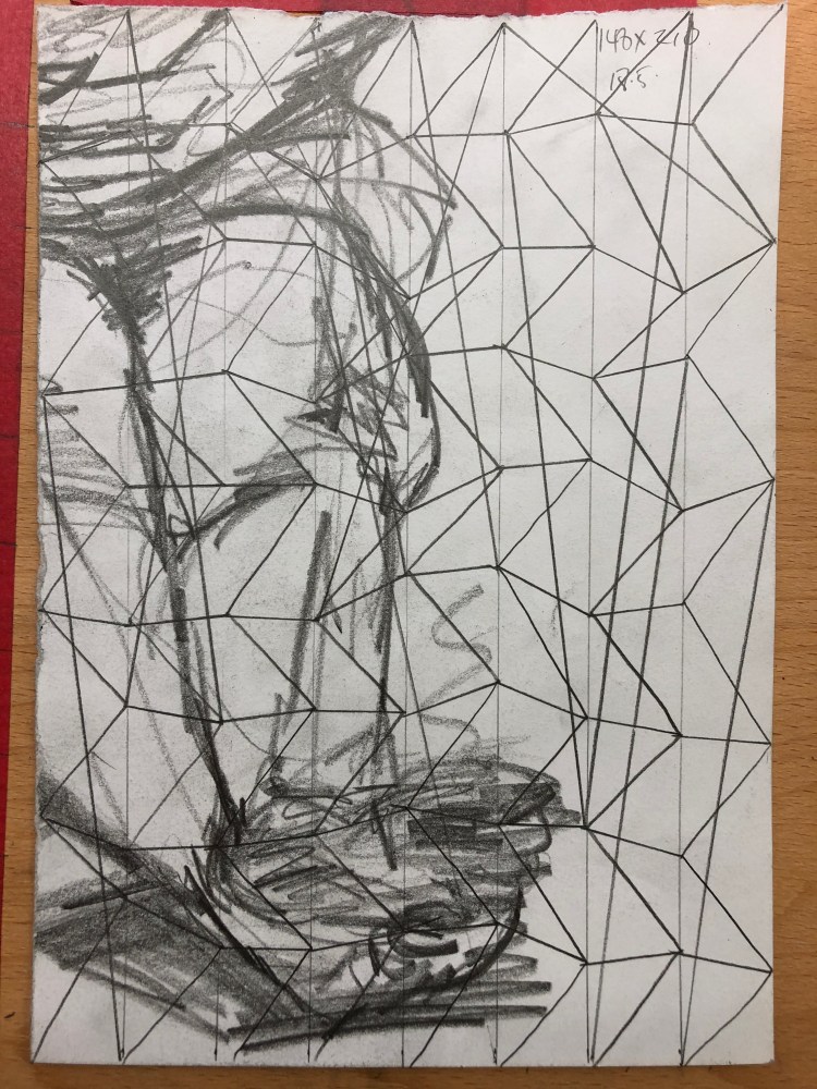 I spent part of my lockdown getting back into my home studio, and in the process of clearing out I found a series of life drawings. I decided to use these and take the figure into a more abstracted space by applying the system 7 x 9 to them. I divided the drawings up and tore them into smaller pieces. I then divided some up with lines making division by seven and the rest were turned landscape and divided by nine lines. I then used the connection of the other number, nine and seven respectively. So for the pieces with seven divisions, I would draw nine connections making cells. I then drew and shaded sections and also erased whole lengths and then redrew to disrupt the figure within the drawing.