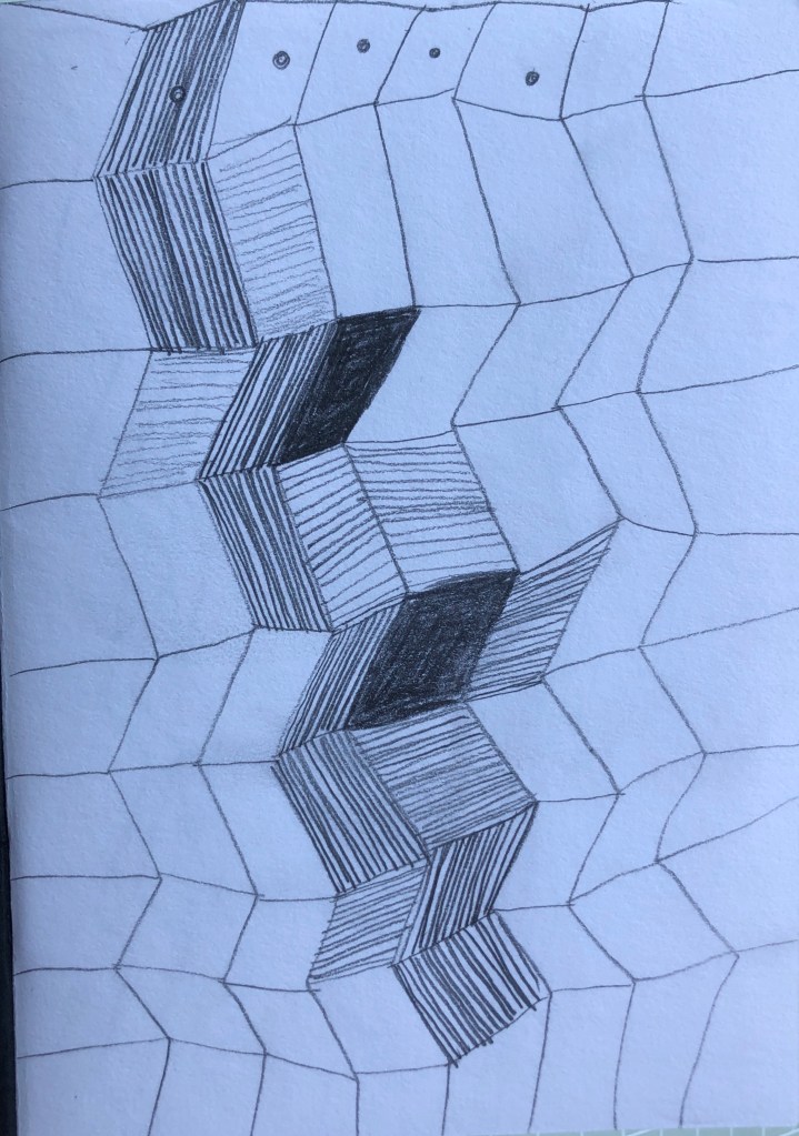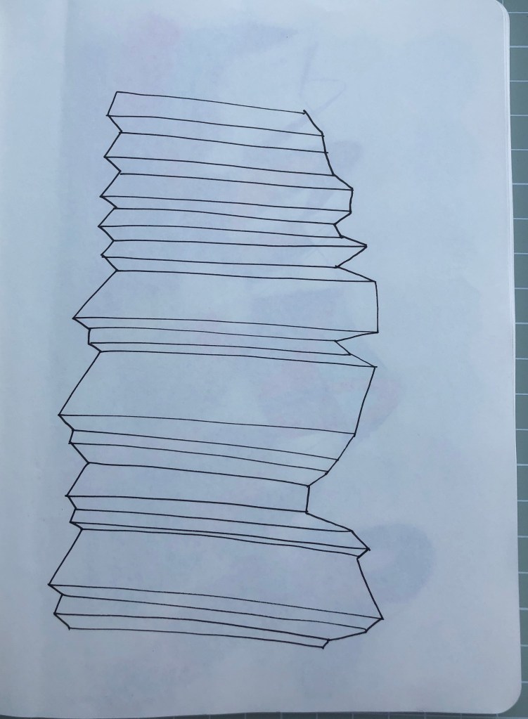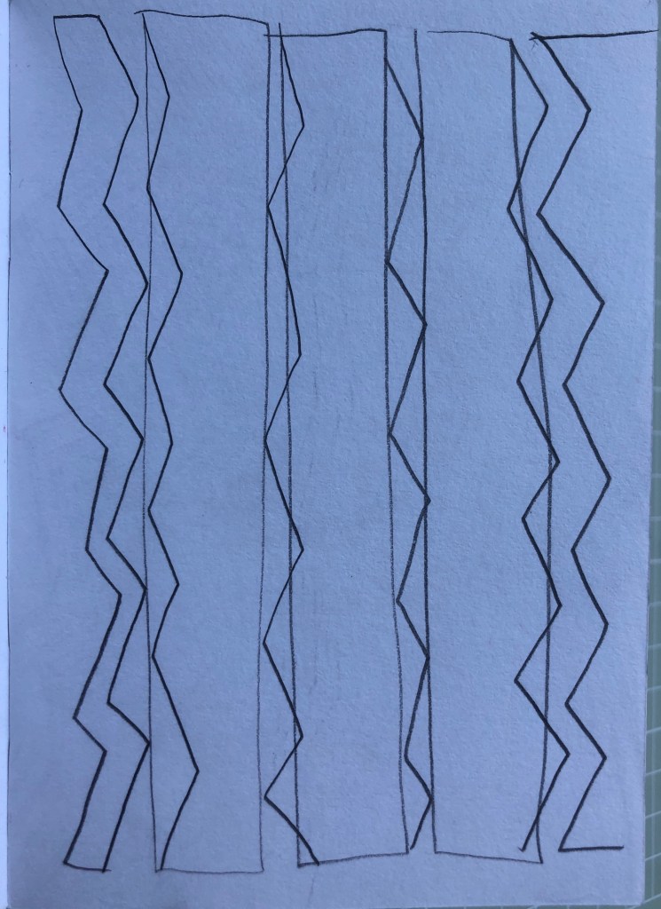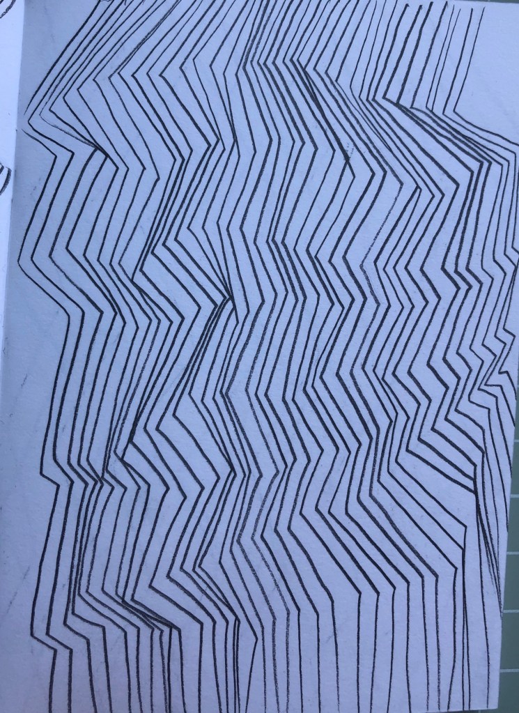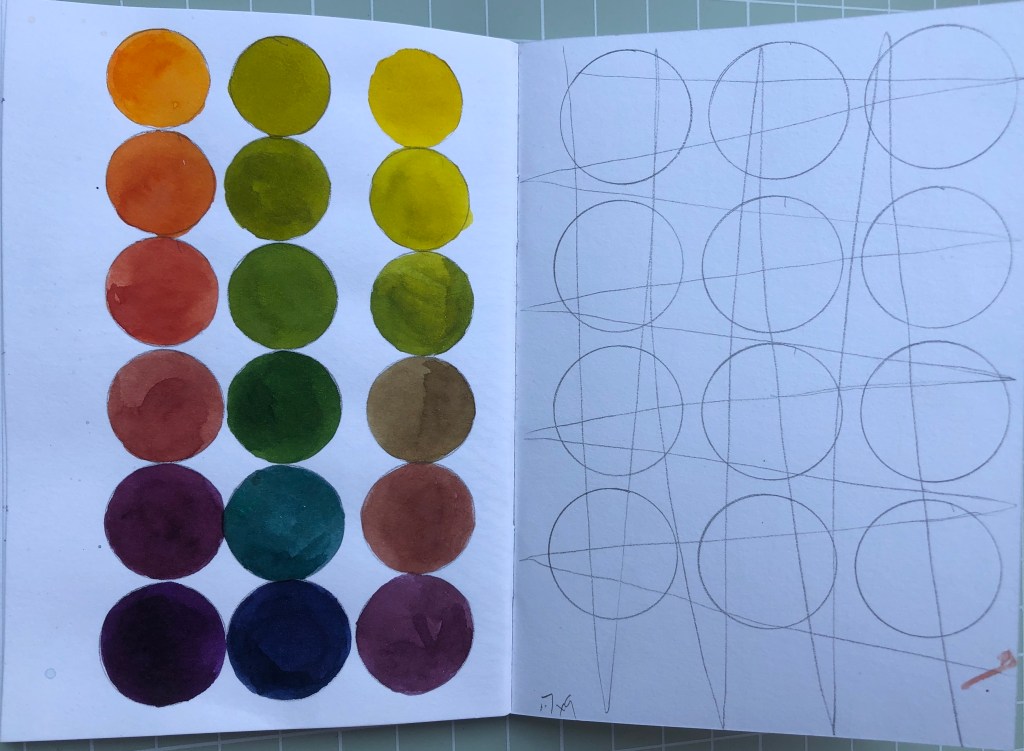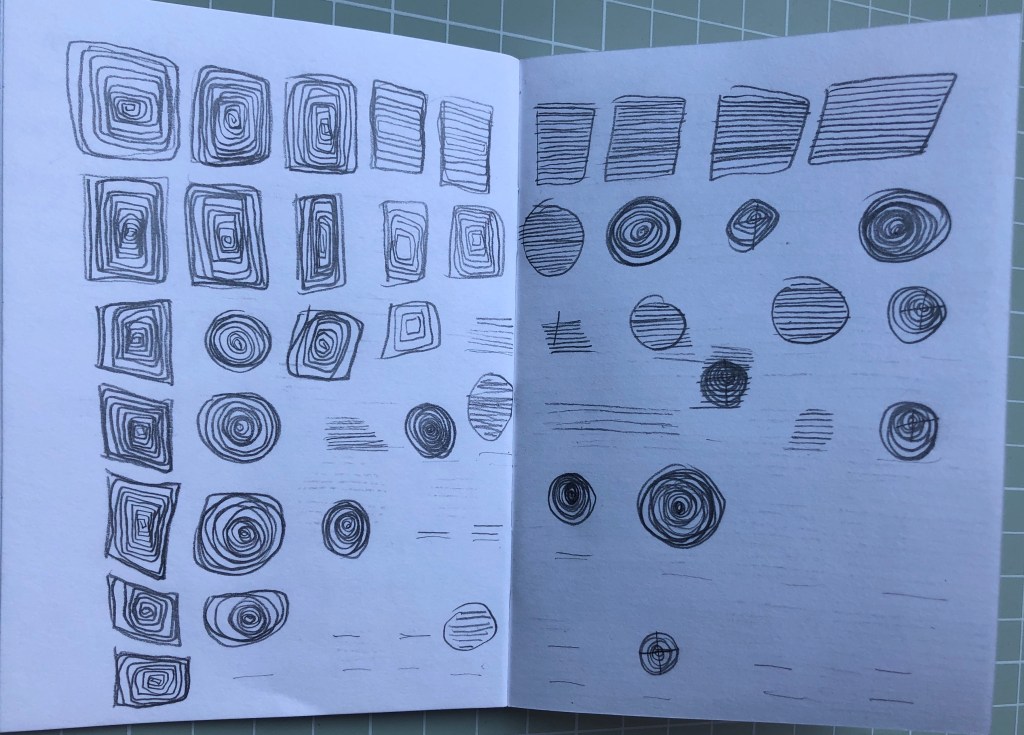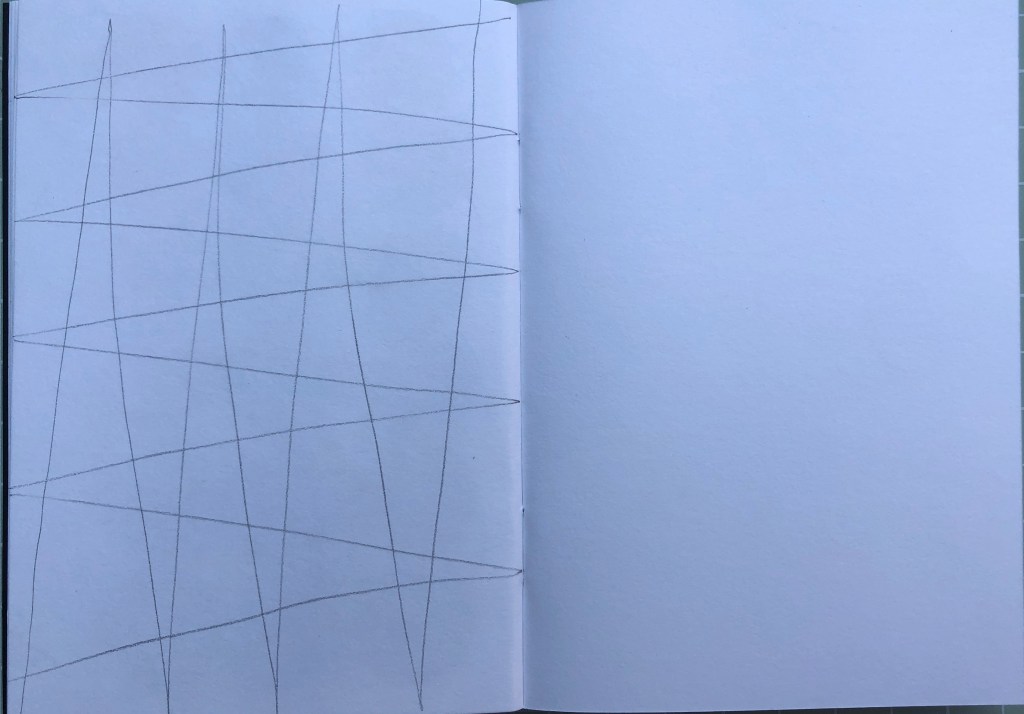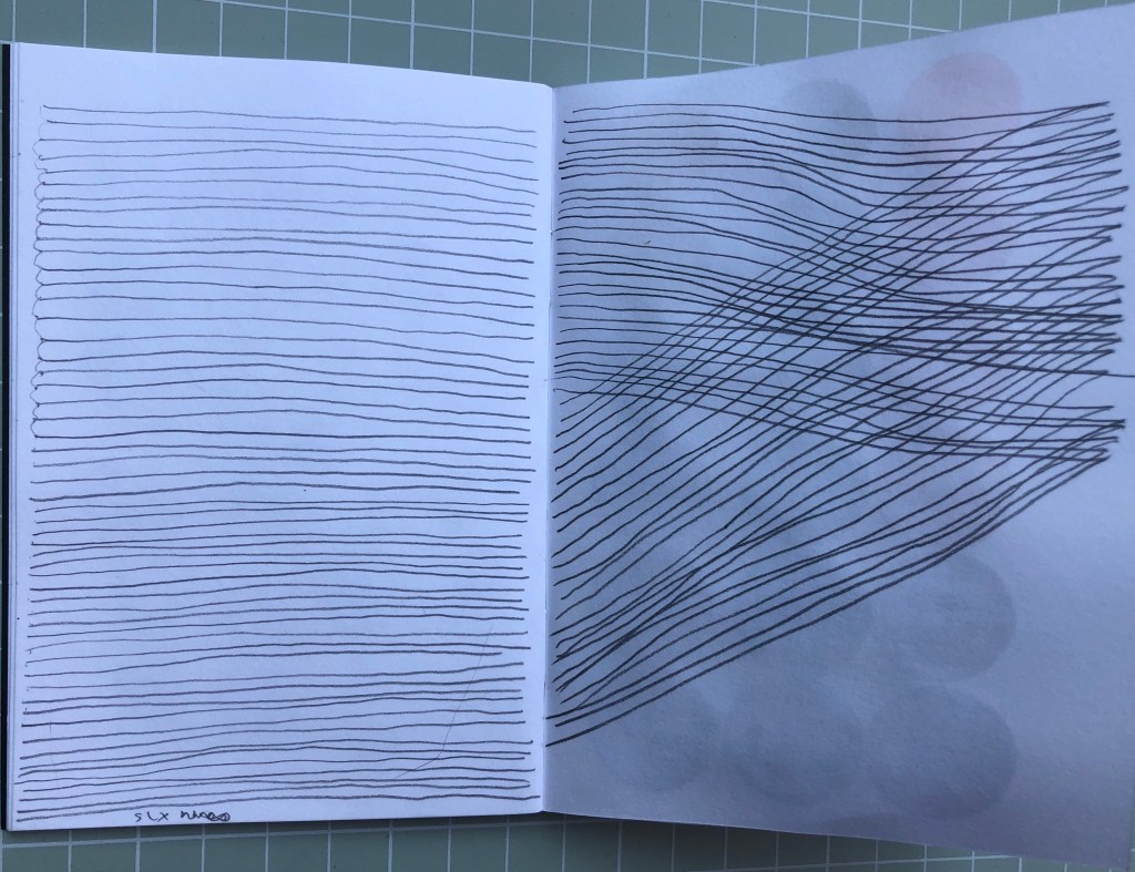 This is a series of sketchbook pages, I have worked through from 7×9 and with pencil drawn the system in different ways. I have moved into pure line drawings and then varied the system with circles, using objects from my childhood then working in with watercolour using colours that are heard in the Eno music.