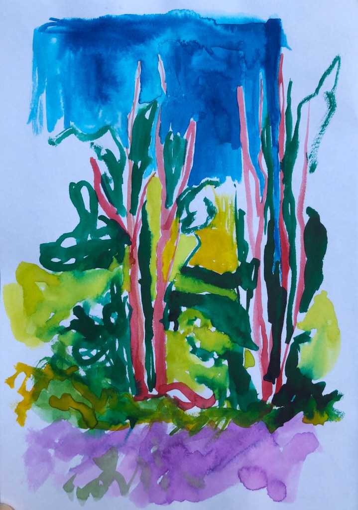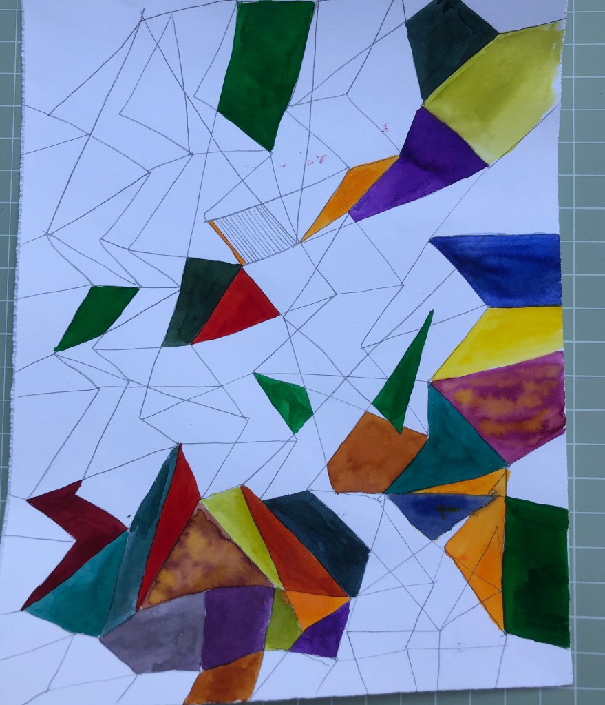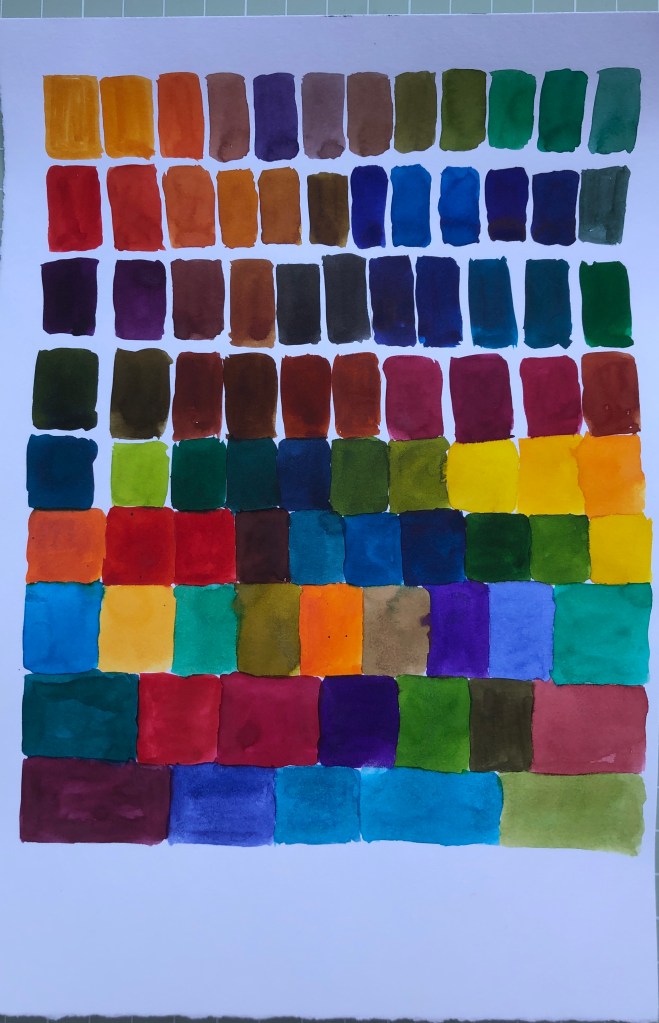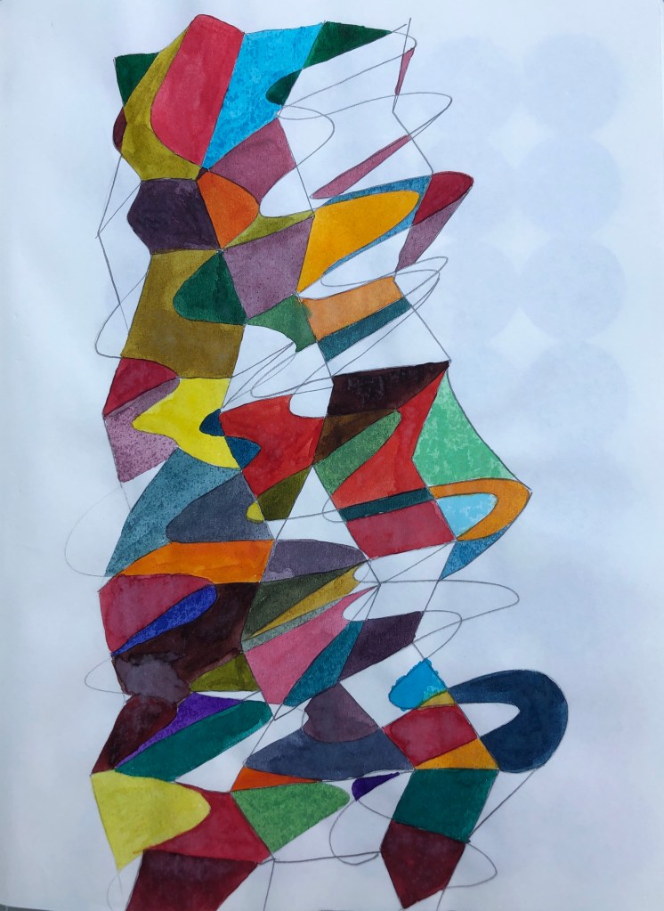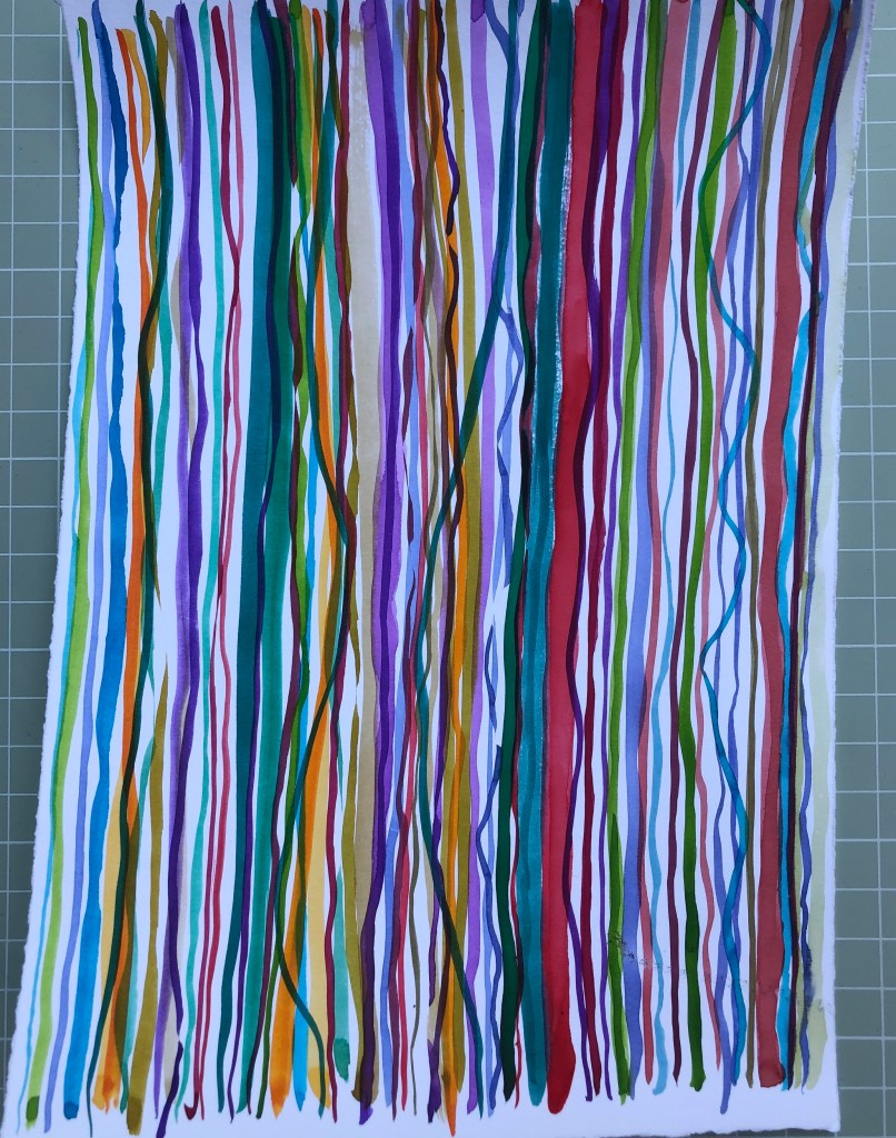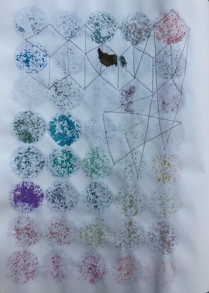 During recent work and whilst listening to Ambient 1 by Brian Eno, I have returned to the use colour in my work. I used to make vibrant watercolours, but having grown sceptical about the use of colour and maybe being overwhelmed by it, I had not used it for decades in this way. After discussions with my tutor Kerry Andrews I decided now was as good a time as any to really explore this link between sound, math and colour that is revealing itself in my work process. Below are some of the works I have produced.