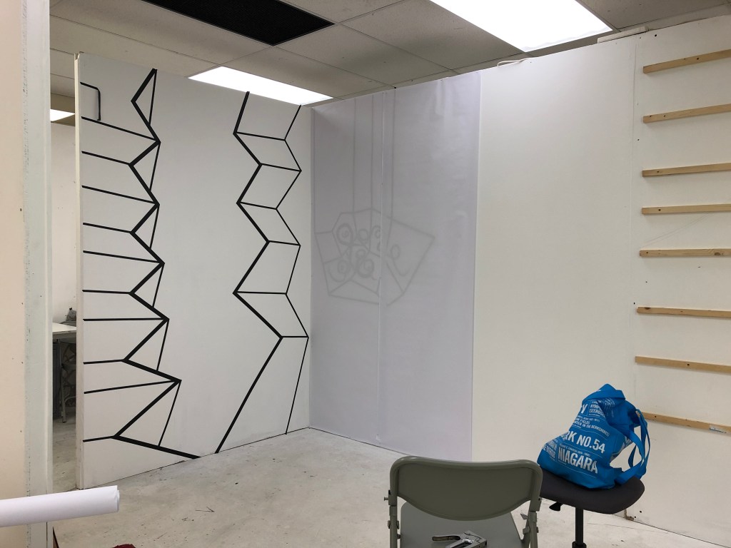 At this point of having drawn most of the tape I wanted to, I decided to try a drawing on paper intervention and then have this drawing leaning out from the installation. I had tried this in my proposal work for Practice One. See below.