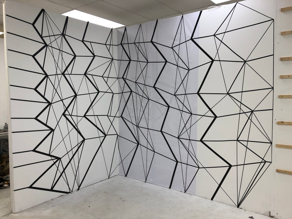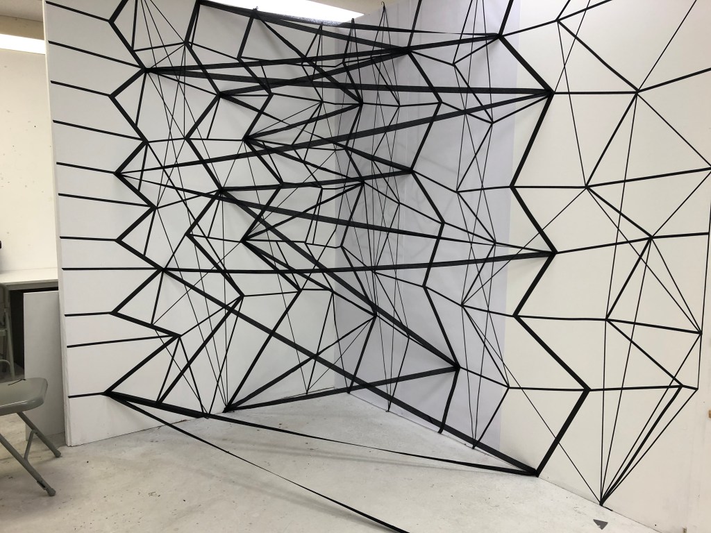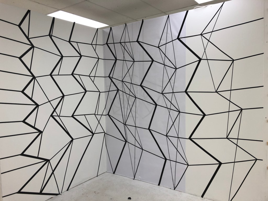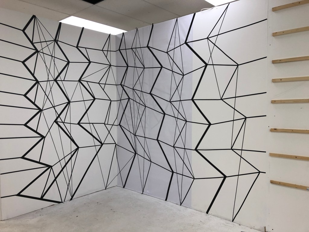 The image gallery below show the original installation made in black tape which had to be abandoned during the lockdown. I put paper over the right hand side of the piece to develop this further in Lines and Cells 2020 Part Three.