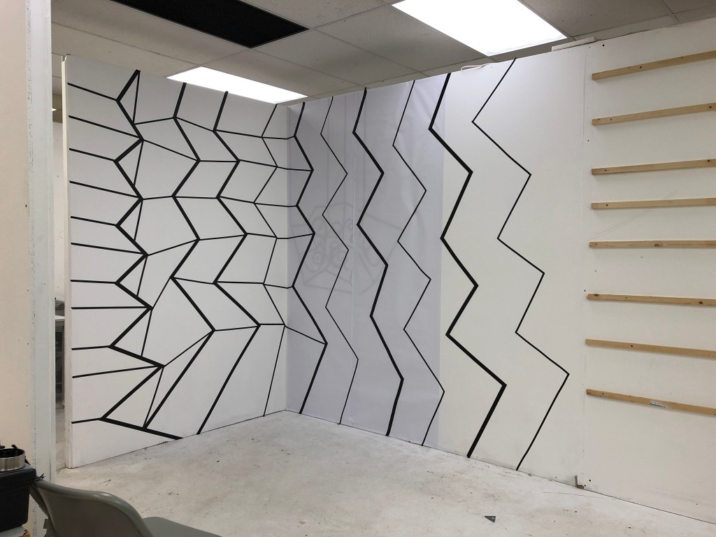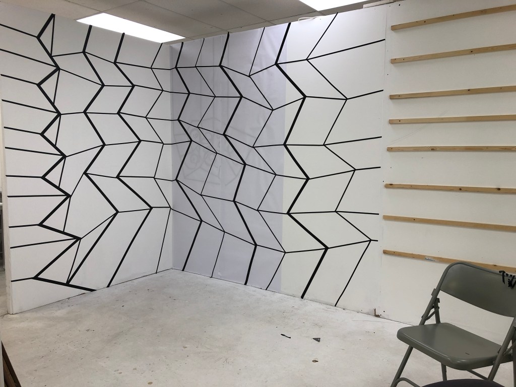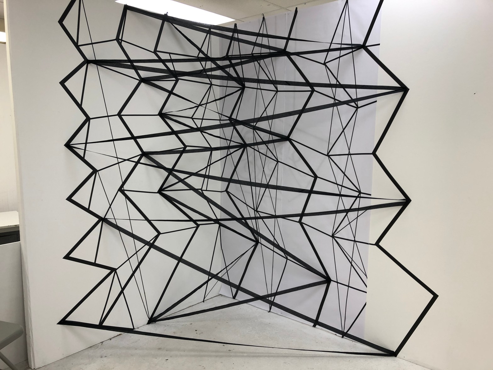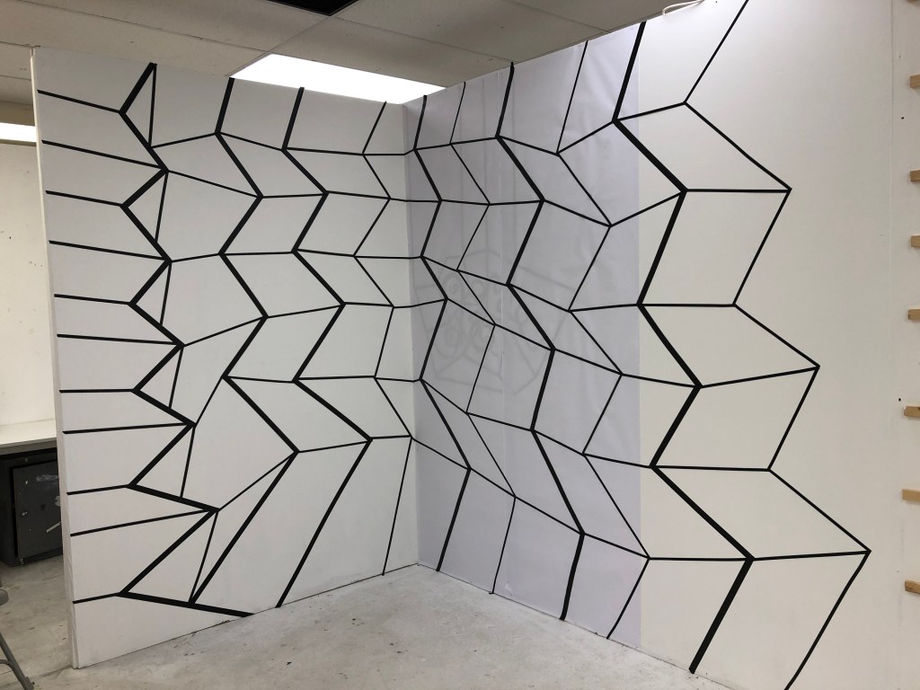 The image gallery below show the original installation made in black tape which had to be abandoned during the lockdown. I put paper over the right hand side of the piece to develop this further in Lines and Cells 2020 Part Three.