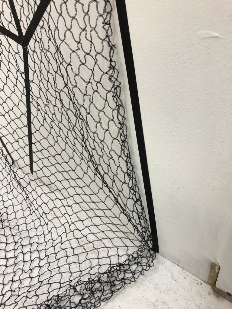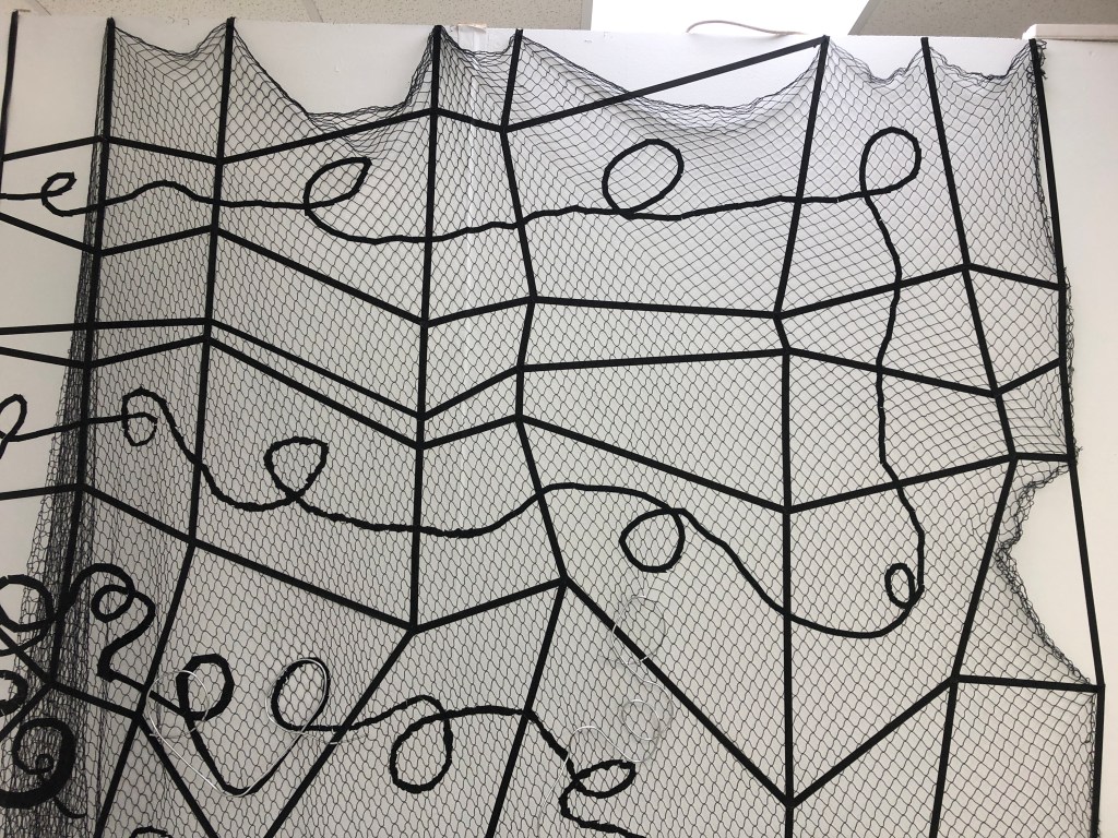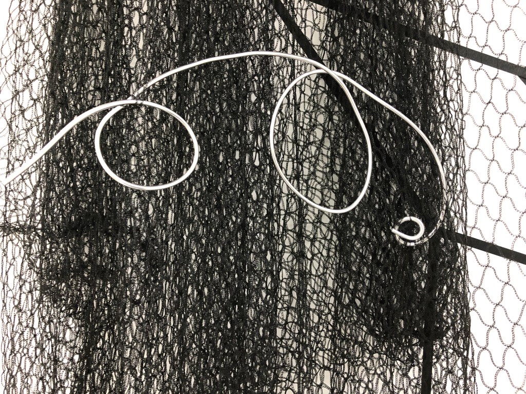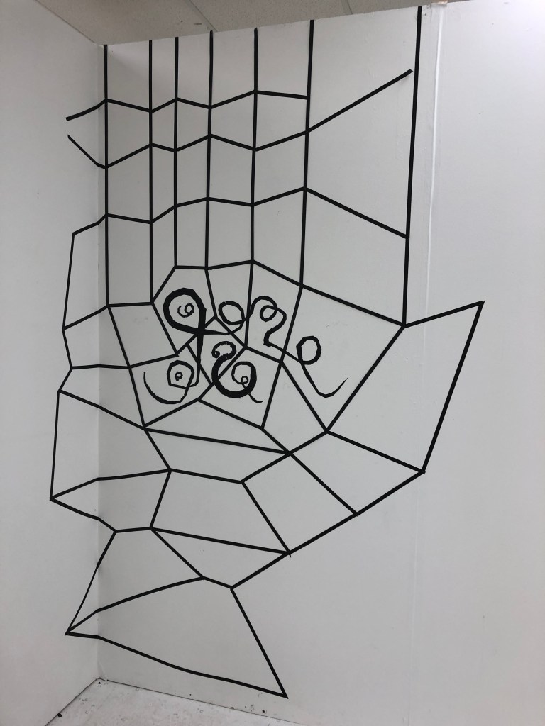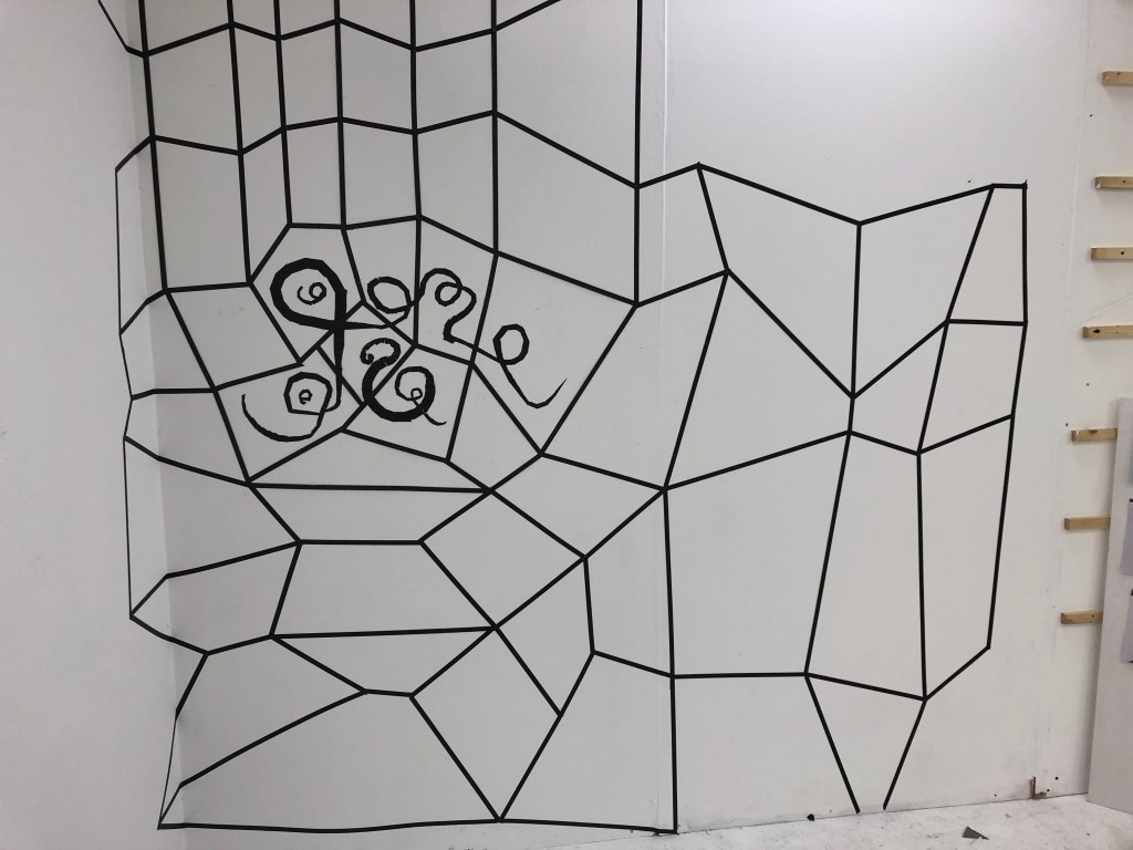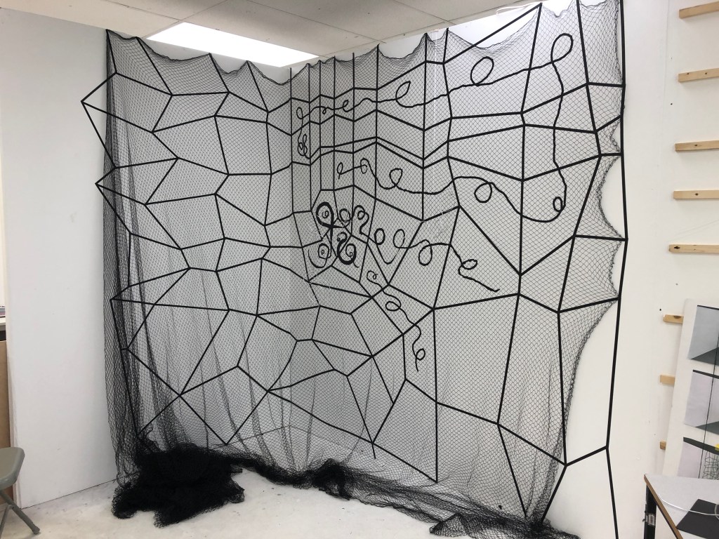 When I was able to return to the Postgraduate studio in September 2020 I set about making the work and adding to it how I had imagined it. I made three iterations of this installation. One the drawing with tape, the second veiling the drawing with net and thirdly I drew into the net with aluminium wire and chord.
