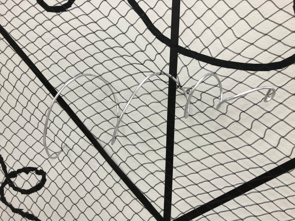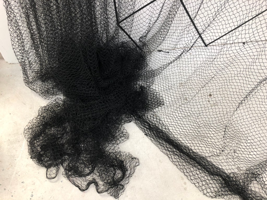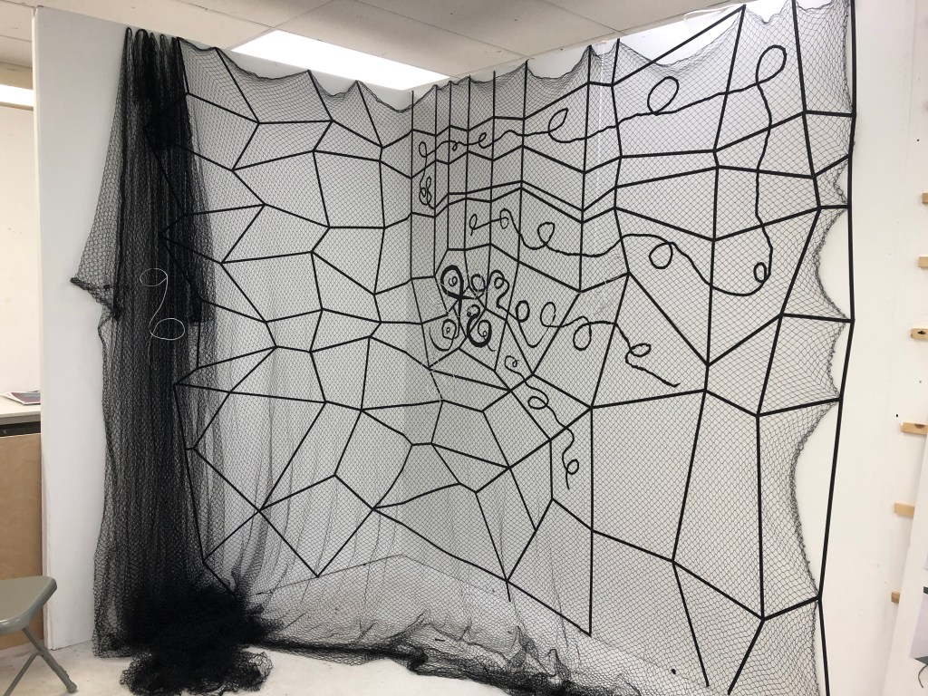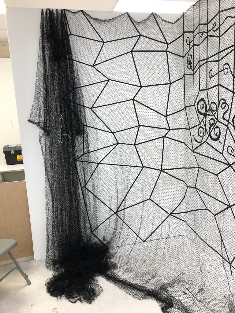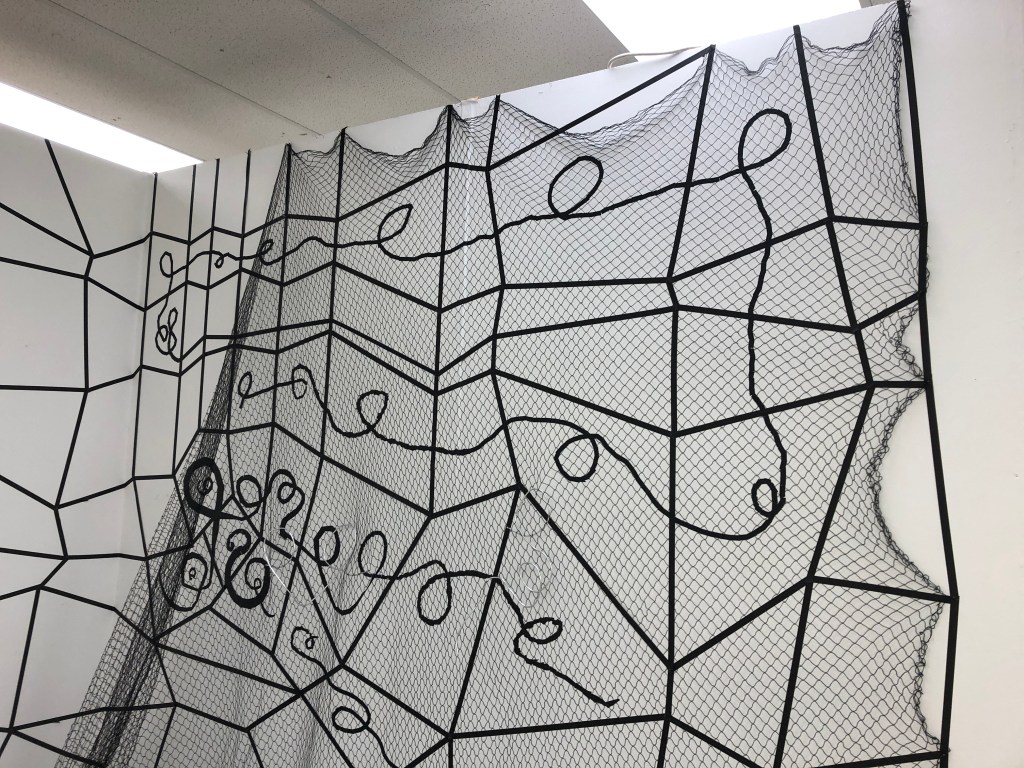 When I was able to return to the Postgraduate studio in September 2020 I set about making the work and adding to it how I had imagined it. I made three iterations of this installation. One the drawing with tape, the second veiling the drawing with net and thirdly I drew into the net with aluminium wire and chord.