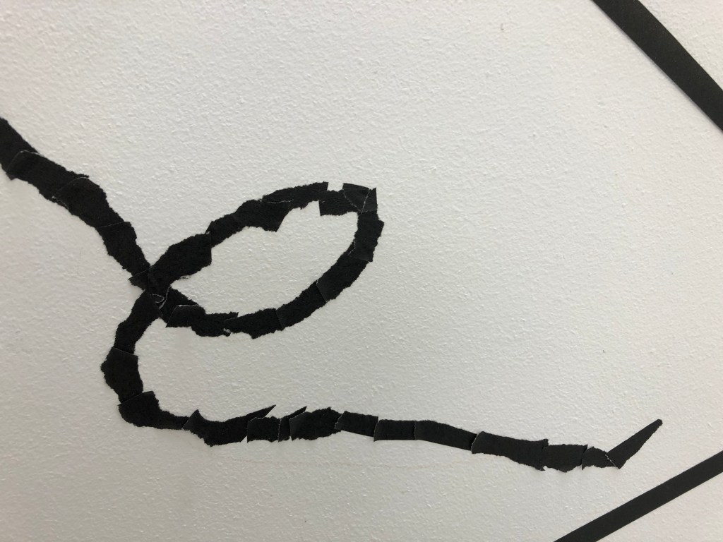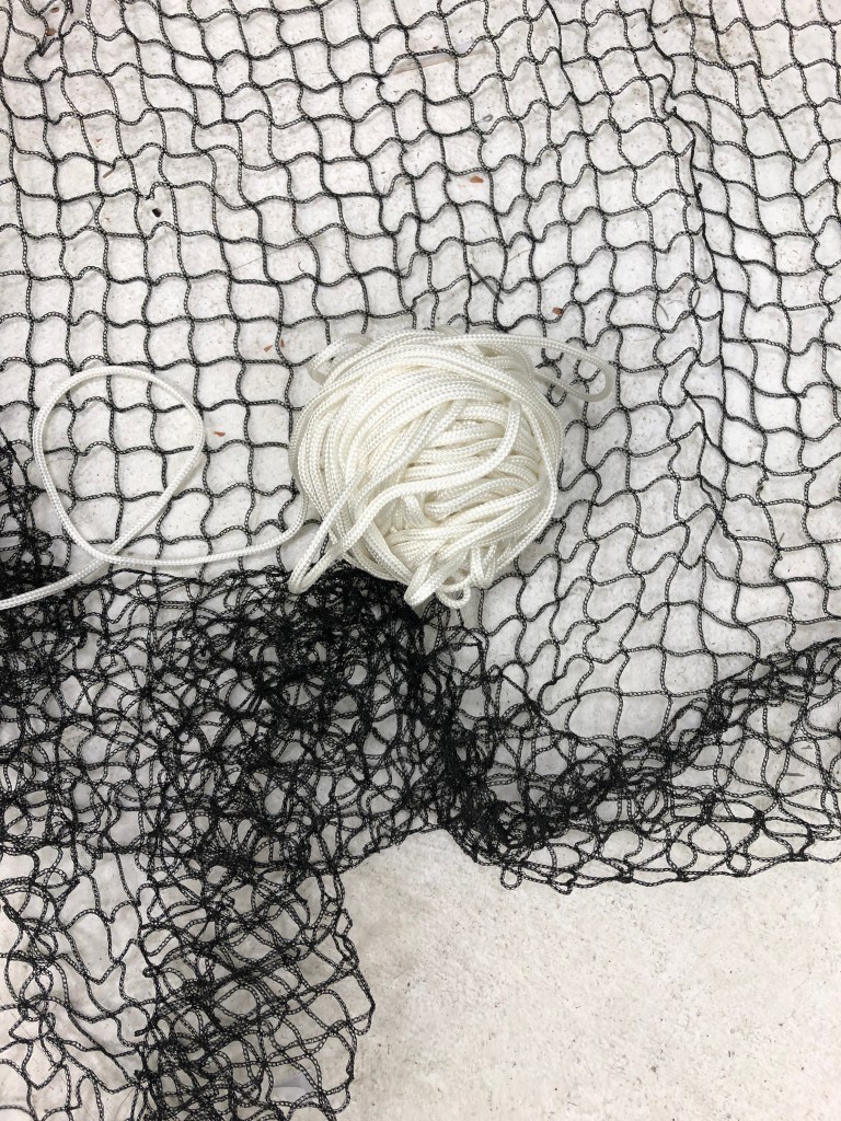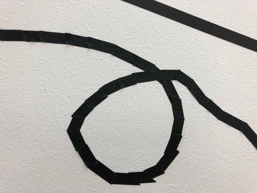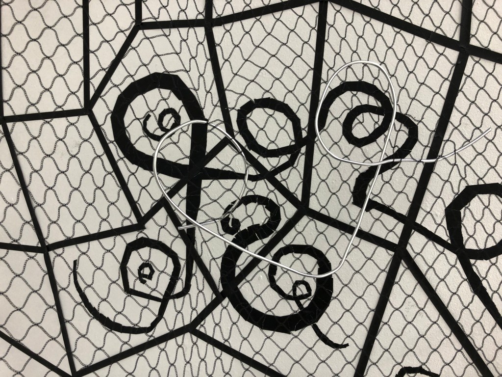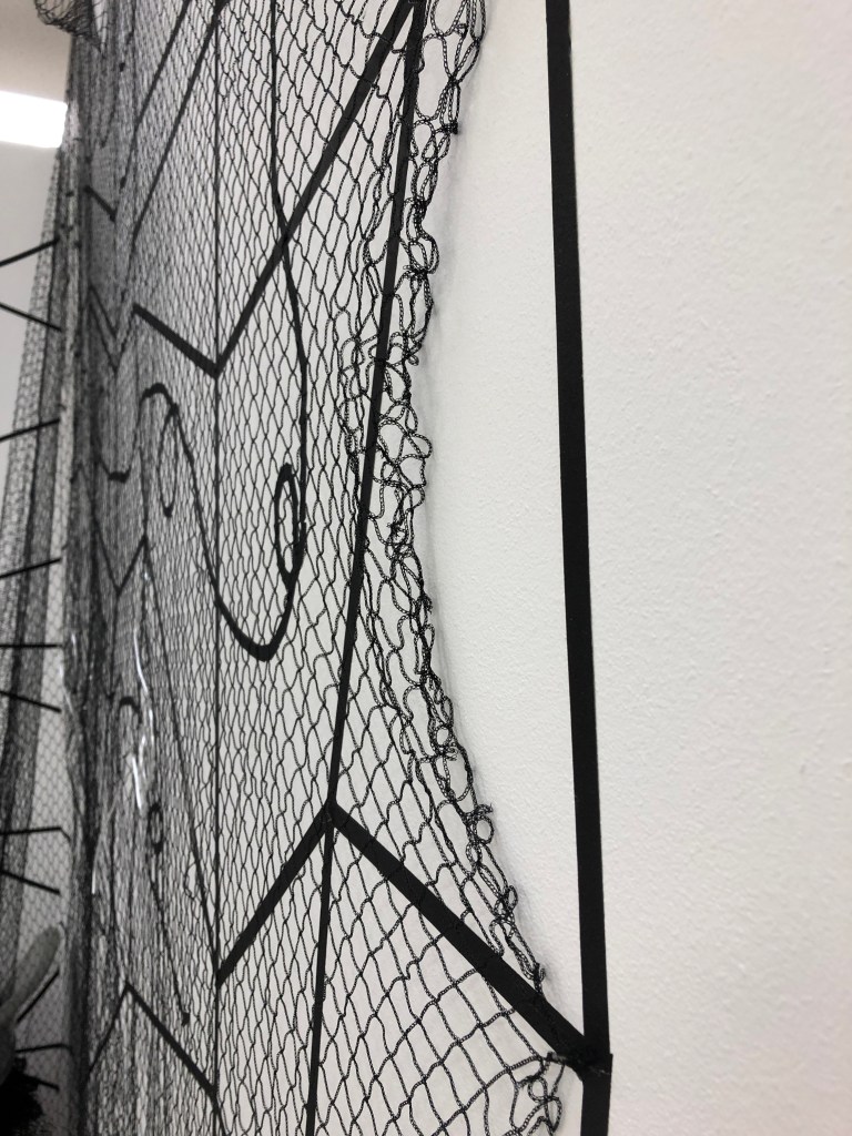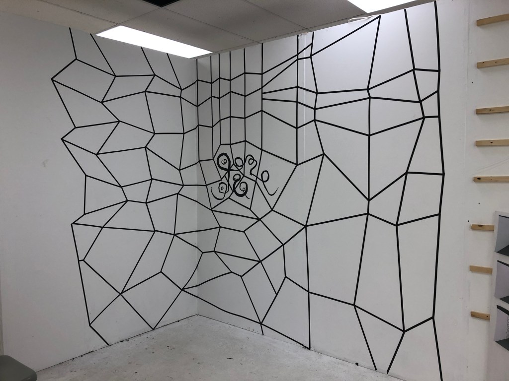 When I was able to return to the Postgraduate studio in September 2020 I set about making the work and adding to it how I had imagined it. I made three iterations of this installation. One the drawing with tape, the second veiling the drawing with net and thirdly I drew into the net with aluminium wire and chord.