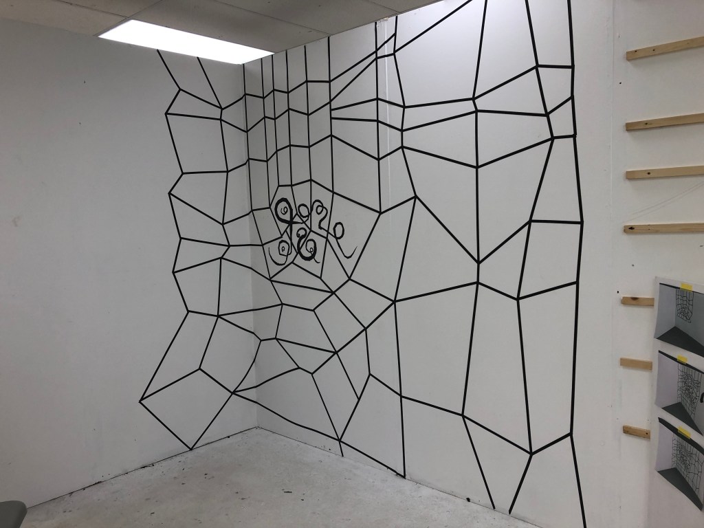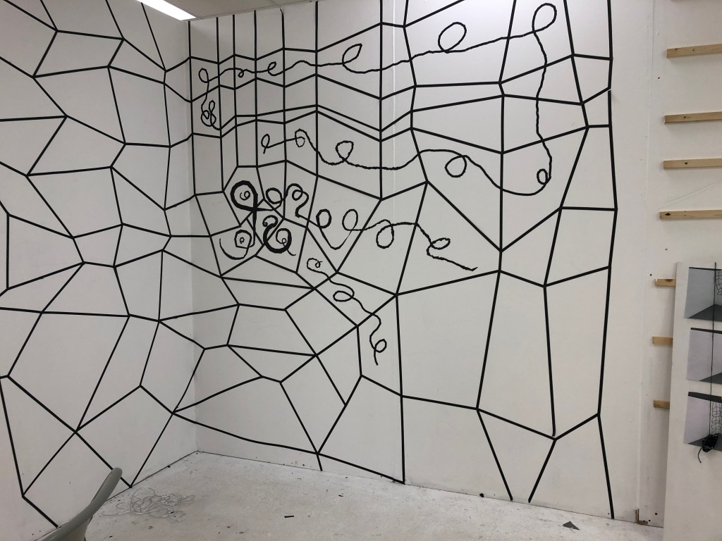 I am going to get longer lengths of aluminium to work into larger three dimensional drawings. There are many variations I would like to explore with this including a way of making the drawings easier to make, as they are very time consuming. I have discussed making them with oil stick instead of tape and thinking about ways of covering the walls, possibly even having wall paper printed or vinyl decals.
