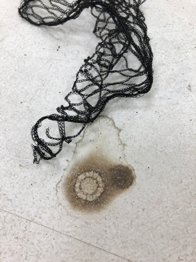 I then added some string drawn elements and additions of some porcelain leaf moulds I had made, I just wanted to place these different elements into the piece. The Film below shows the aluminium drawn three dimensional pieces in the net.