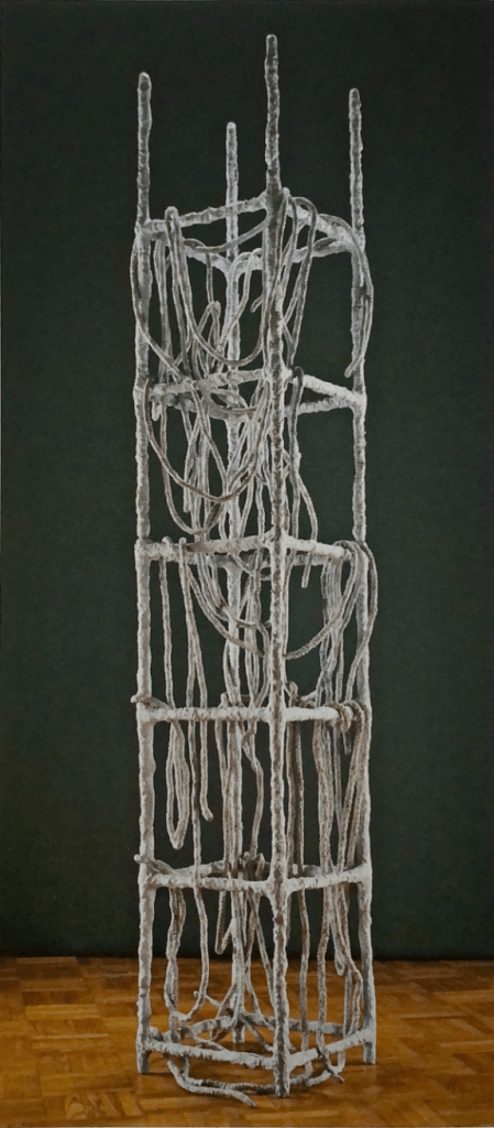 My research into this transition I identified for Eva Hesse’s work started in the year of 1965 when she spent a year working in Germany with her husband Tom Doyle. She began to use materials from the factory they shared as a studio and made three dimensional wall based works with them. The change from painting to three dimensions began in Germany but when she returned to New York, she began again with a table rasa. The work lost the vibrant colour. She made her first free standing sculpture in 1966, Laocoon standing ten feet high ladder like with cords wrapped around in loose curves. Her want was for ‘irrational’ element that was not powerful enough to conquer or balance the rational element. In Lippards mind the piece had less pathos and personnage once Hesse made the piece into a “better sculpture”. (Lippard, 1976)