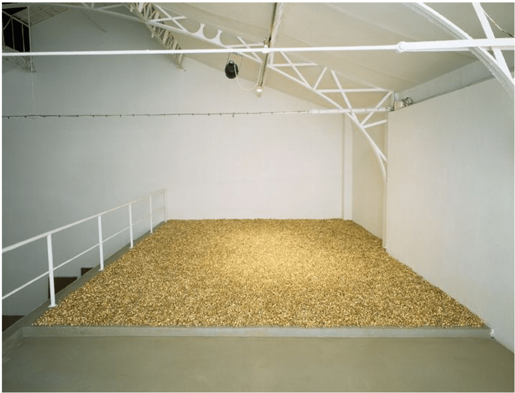 The Gold Field was finally shown in 1990 at the Museum of Contemporary Art, Los Angeles, see Figure 15. Gonzalez-Torres and his partner Ross Laycock saw the piece. Gonzalez-Torres said it changed their lives. He described Gold Field as a ‘gift’ (Gonzalez-Torres, 1990, p.1). He wrote to Horn, stating: ‘The work was needed. This was an undiscovered ocean for us. It was impossible, yet it was real, we saw this landscape. Like no other landscape. We felt it. We travelled together to countless sunsets.’ (Gonzalez-Torres, 1990, p.3). He concluded, ‘we were given the chance to ponder on the opportunity to regain our breath, and breathe a romantic air only true lovers breathe.’ (Gonzalez-Torres, 1990, p.3). In 1993, after Laycock’s death from AIDS, Torres made Untitled (Placebo-Landscape-for Roni) as a response to Gold Field, Figure 16. Russell Ferguson described the installation thus: it ‘is itself a gold field, this one comprising thousands of candies, each wrapped in gold cellophane, Gonzalez-Torres had called Gold Field a gift; that was how he had received it, in a desperate time with Laycock already very ill. Placebo is literally a gift, actually thousands of gifts, since each viewer can take a piece of candy and make the work part of his or her own body by eating it.’ (Ferguson, 2009, p.113). This act of the endless edition is a disruption to the art market and a deliberate intention of the artist to make work egalitarian, available to all.