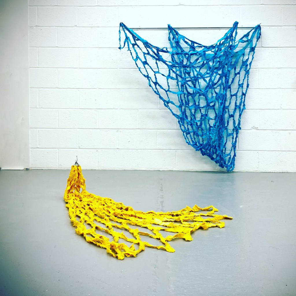 Foreground – Rising shine, rinsed and pinned, 2022, Canvas, dye, salt, steel, fishing wire, silver and koi galvanised wire, 300cm x various